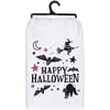A black & white cotton kitchen towel from our Halloween Collection displaying unique hand illustrated designs of Halloween motifs with purple accents and a seasonal sentiment that reads "Happy Halloween." Our Happy Halloween kitchen towel is conveniently machine-washable for easy cleaning. Seasonal kitchen towel is packaged on a black plastic hanger to easily display on rack. A fun Halloween kitchen accessory perfect for seasonal use.