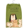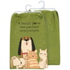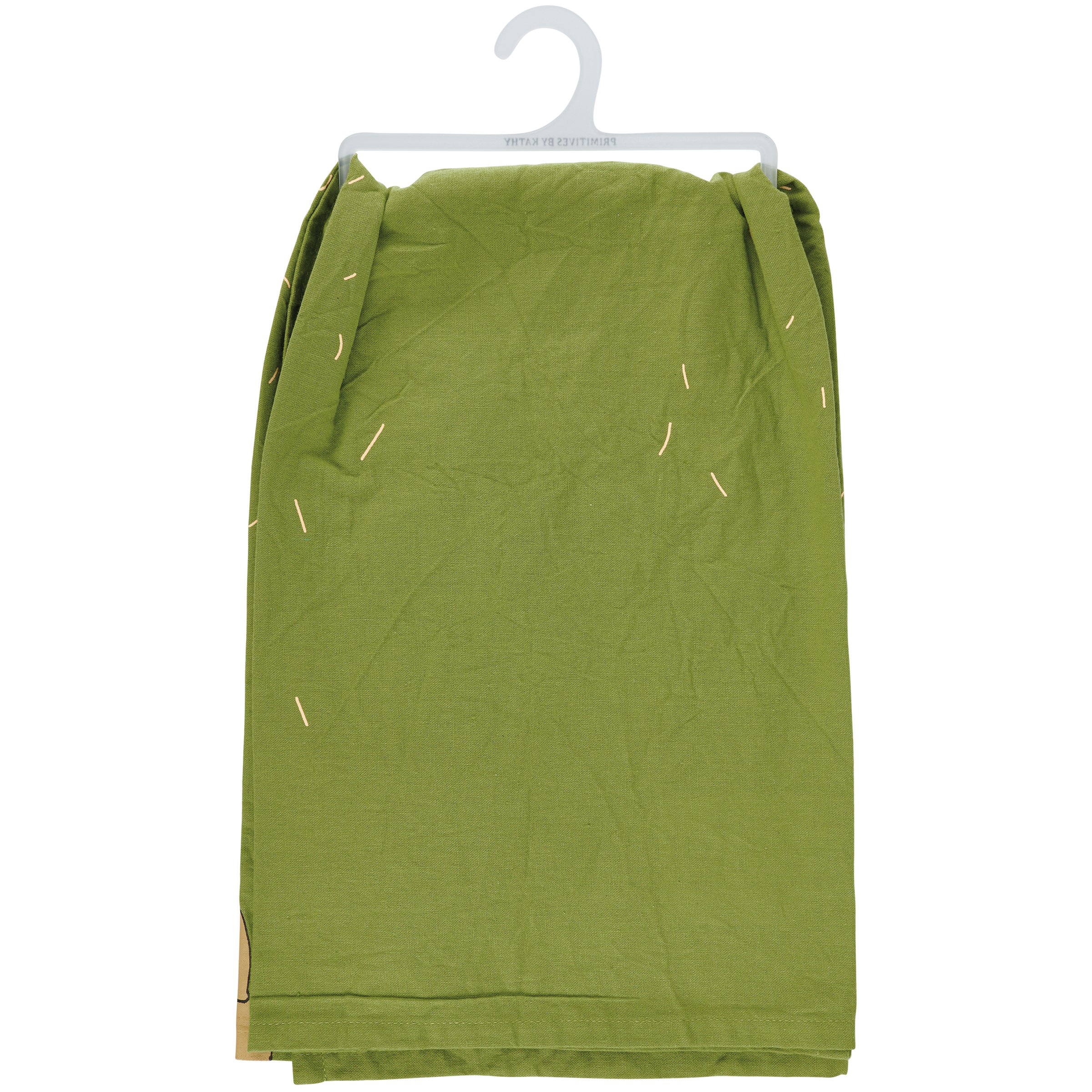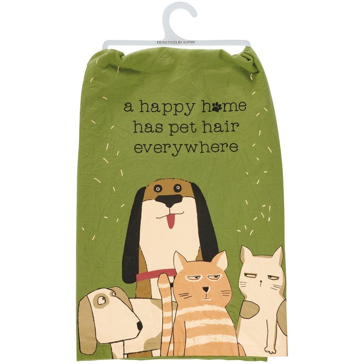 A green cotton kitchen towel from our Pet Collection displaying a rustic design of sassy cats and dogs with a pet hair accents throughout the towel as well as a fun pet inspired sentiment that reads "A Happy Home Has Pet Hair Everywhere." Our Happy Home Pet Hair kitchen towel is conveniently machine-washable for easy cleaning. Funny kitchen towel is packaged on a clear plastic hanger to easily display on rack. A fun pet-themed kitchen accessory perfect for everyday use.