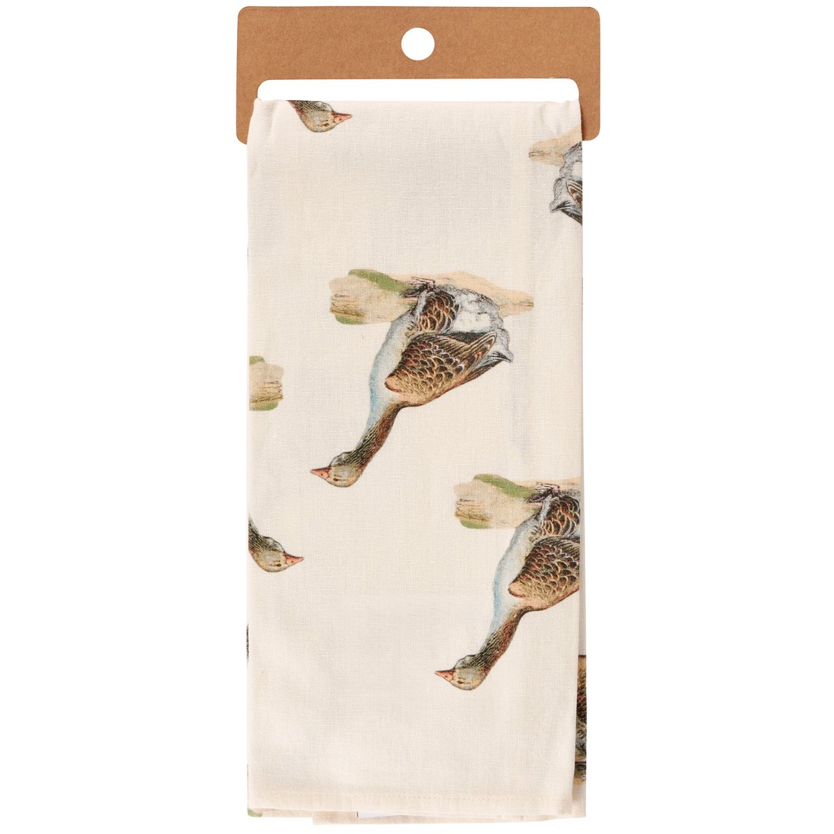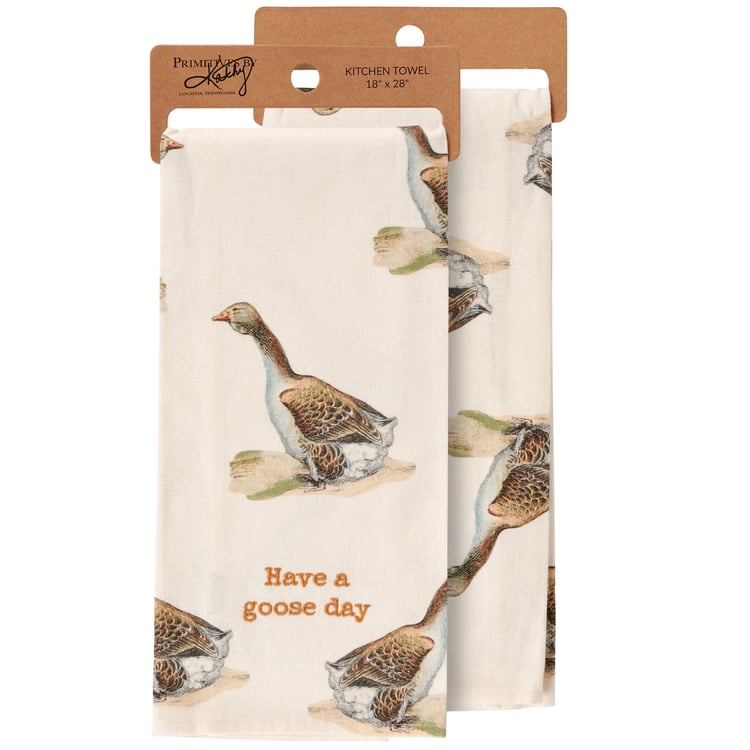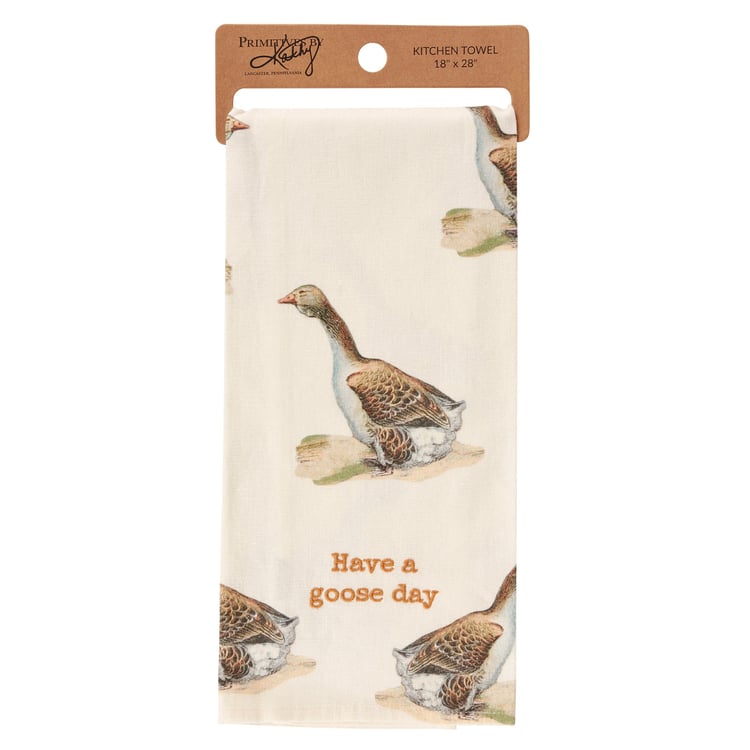 A cotton-linen kitchen towel from our Farmhouse Collection displaying all-over design of vintage goose art with a fun goose-themed pun that reads "Have A Goose Day." Goose sentiment is embroidered for added interest. Our Have A Goose Day kitchen towel is conveniently machine-washable for easy cleaning. Farm kitchen towel is packaged on a cardboard hanger with hole to easily display on rack. A fun farm-themed kitchen accessory perfect for everyday use.