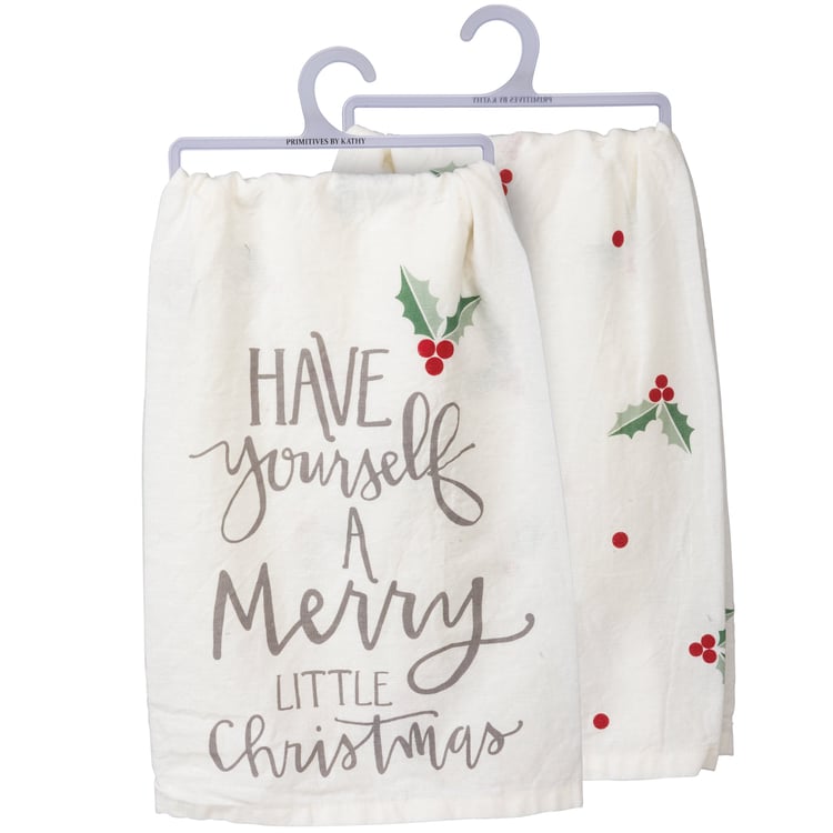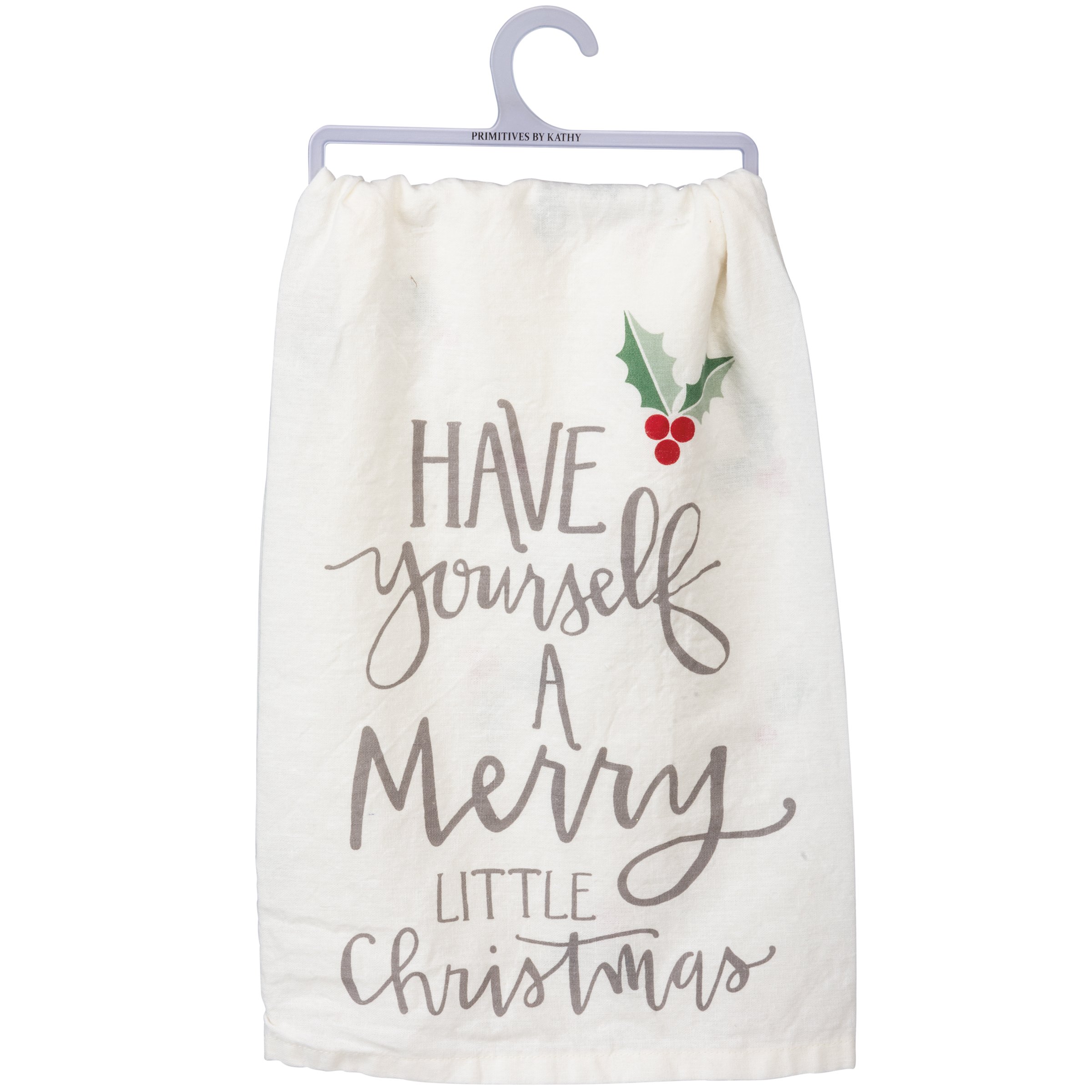 A cotton kitchen towel featuring a festive hand lettered "Have Yourself A Merry Little Christmas" sentiment with holly and dot designs throughout in a neutral palette. Machine-washable. Complements well with coordinating pieces in collection for a charming seasonal display.