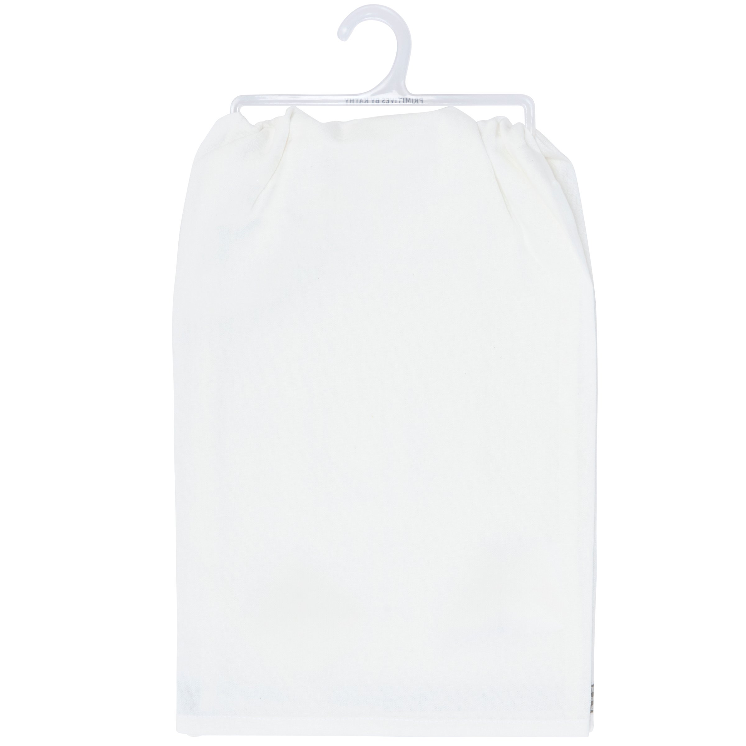 A white cotton kitchen towel from our Trash Talk By Annie Collection displaying a vintage black and white photograph on a stitched art panel complemented with a humorous sentiment that reads "I Just Grabbed The Milk From The Fridge And I'm Pretty Sure I Heard The Wine Say 'WTF.'" Funny kitchen towel also features a gray gingham ribbon along the bottom. Our Heard The Wine kitchen towel is conveniently machine-washable for easy cleaning. Kitchen towel is packaged on a clear plastic hanger to easily display on rack. A fun vintage style kitchen accessory great for everyday gifting.