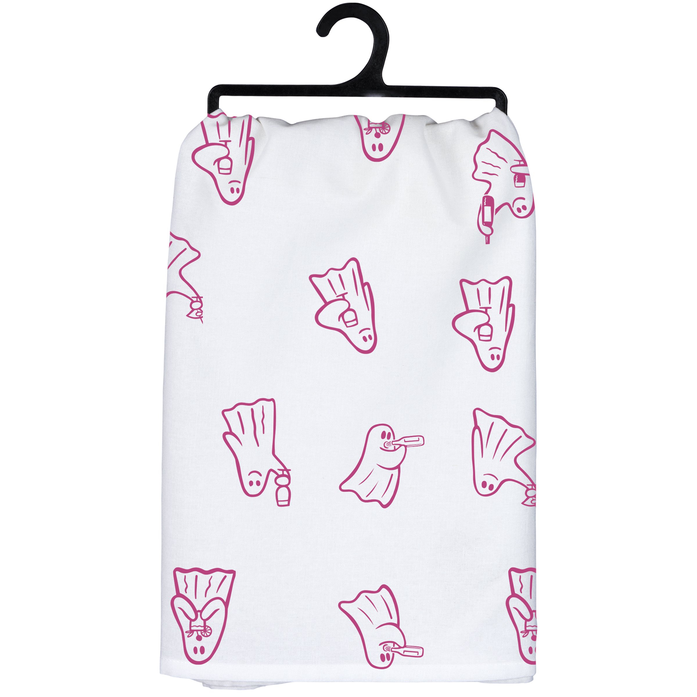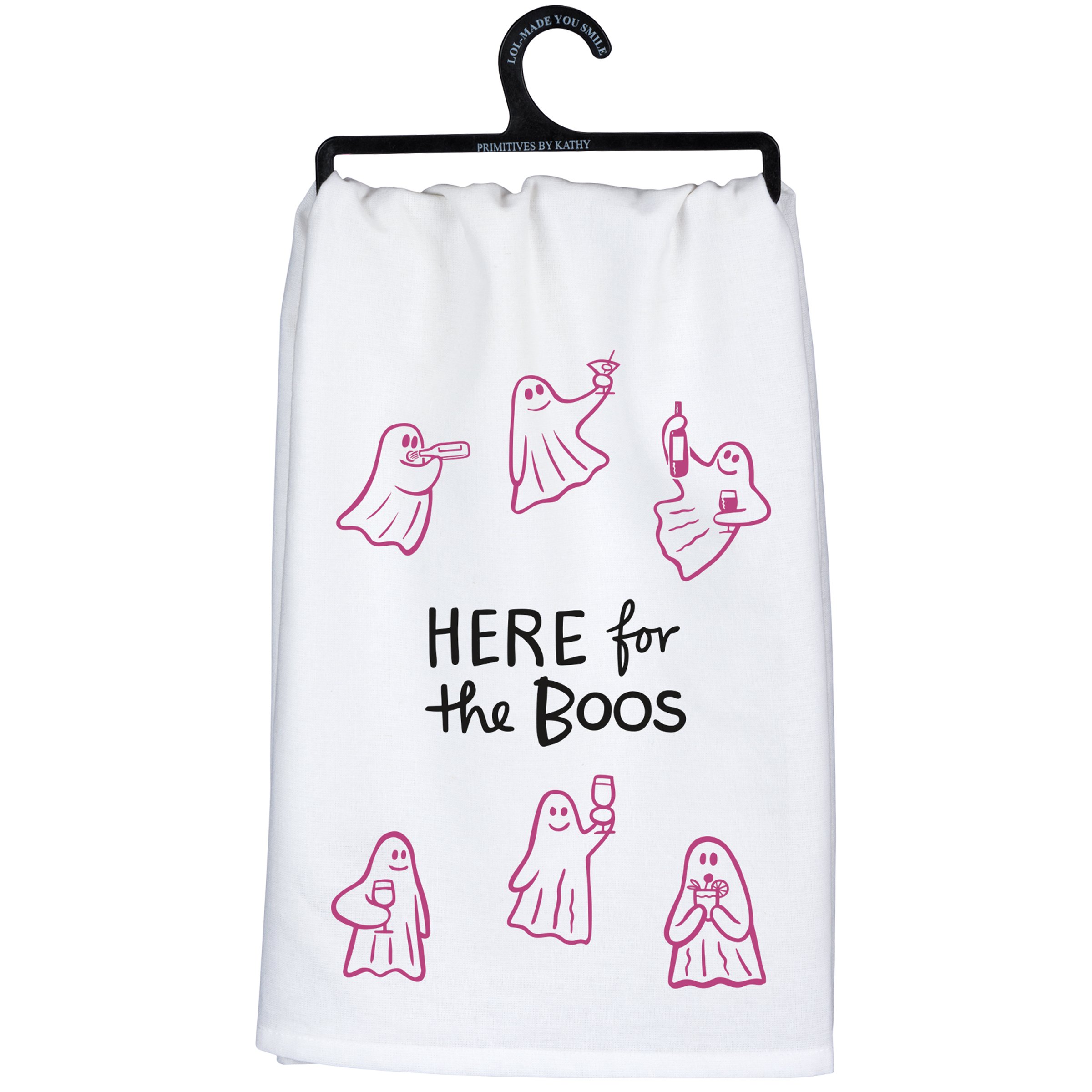 A cotton kitchen towel from our Halloween Collection displaying an all-over design of unique hand illustrated ghosts holding drinks with a fun Halloween inspired sentiment that reads "Here For The Boos." Our Here For The Boos kitchen towel is conveniently machine-washable for easy cleaning. Seasonal kitchen towel is packaged on a black plastic hanger to easily display on rack. A fun Halloween-themed kitchen accessory perfect for seasonal use.