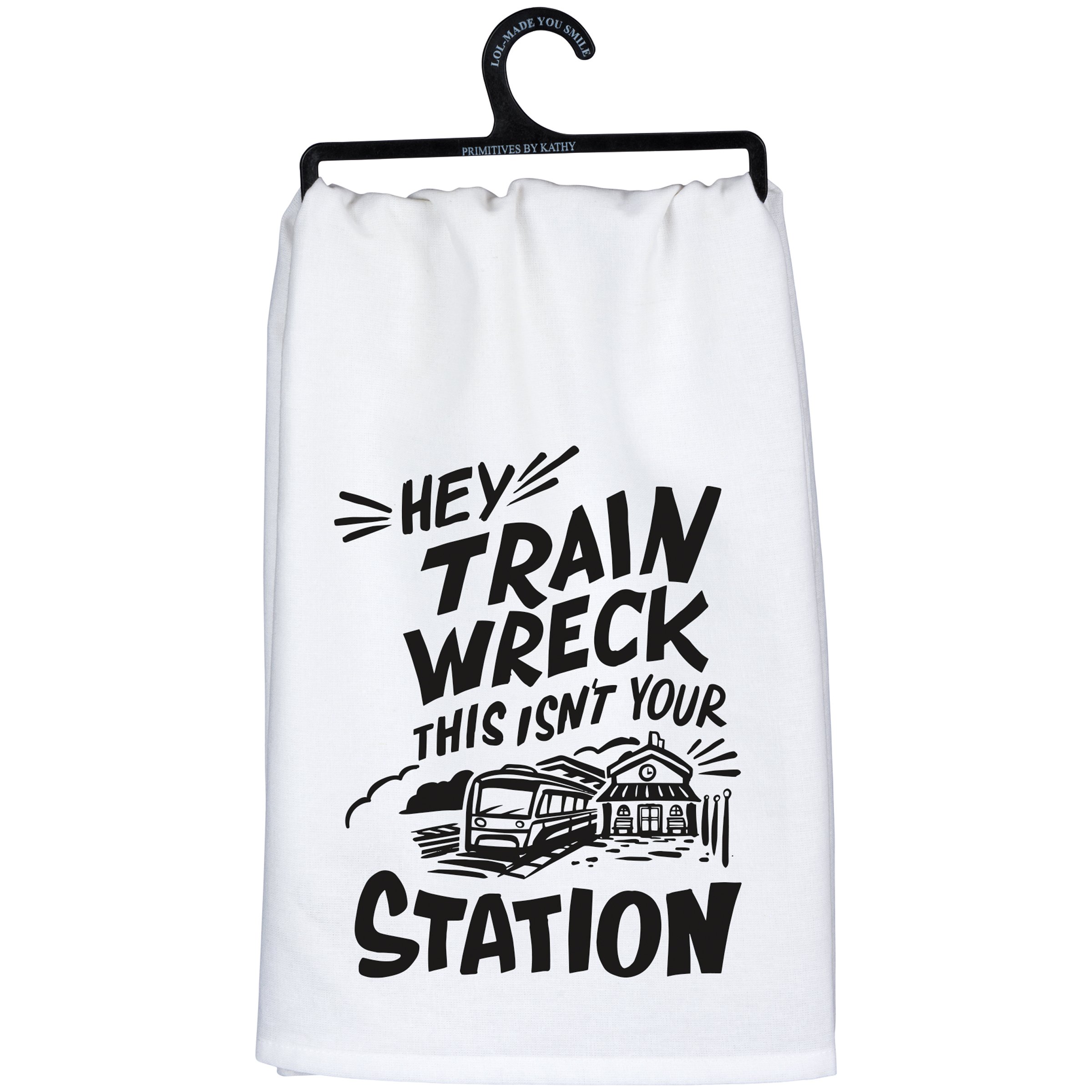 A black and white cotton kitchen towel from our LOL-Made You Smile Collection displaying a train stop and sassy sentiment in a playful hand illustrated style that reads "Hey Train Wreck - This Isn't Your Station." Our Hey Train Wreck kitchen towel is conveniently machine-washable for easy cleaning. This funny kitchen towel is packaged on a black plastic hanger to easily display on rack. A sassy gift perfect for adding personality to any kitchen.
