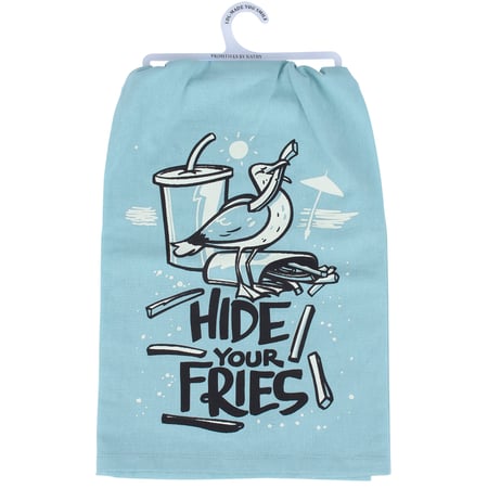 An ocean blue cotton kitchen towel from our Beach Collection displaying a playful hand illustrated scene of a bird eating french fries with a fun beach inspired sentiment that reads "Hide Your Fries." Our Hide Your Fries kitchen towel is conveniently machine-washable for easy cleaning. This beach kitchen towel is packaged on a white plastic hanger to easily display on rack. A fun beach themed gift perfect for adding personality to any kitchen while showing off a love for the beach.