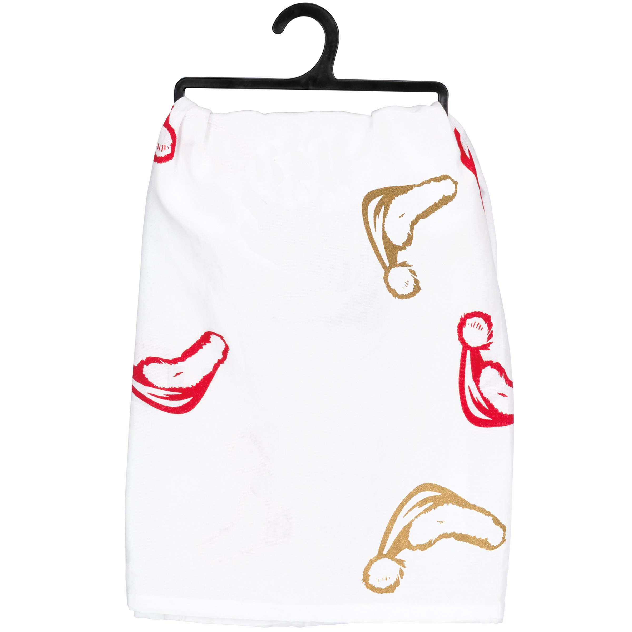 A festive cotton kitchen towel lending "Ho-Ho-Holy Shit I Need A Drink" sentiment with double-sided Santa hat designs and metallic accents. Machine-washable.