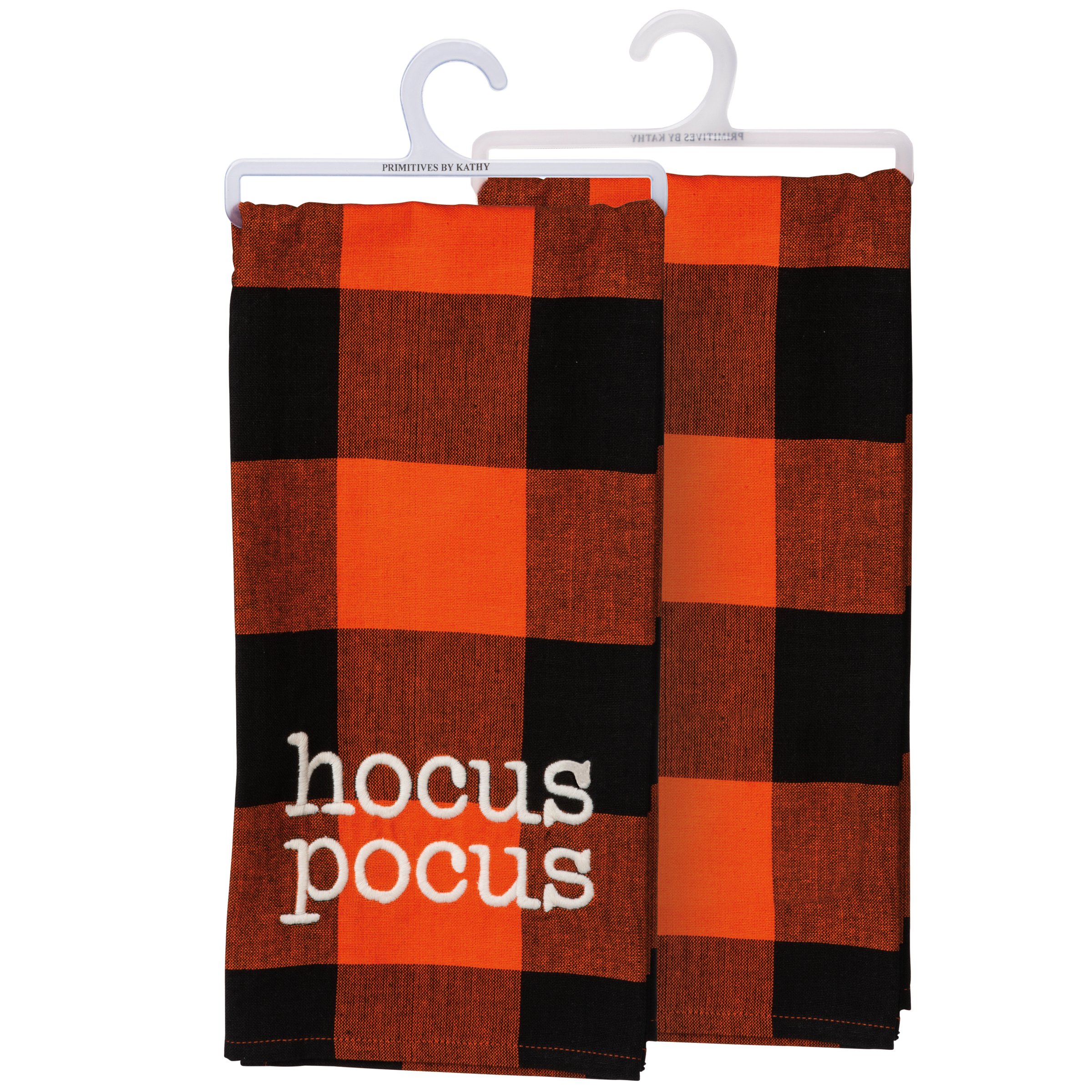 A cotton kitchen towel from our Halloween Collection featuring an all-over orange and black buffalo check pattern and embroidered "Hocus Pocus" sentiment in white. This Hocus Pocus kitchen towel is machine-washable.
