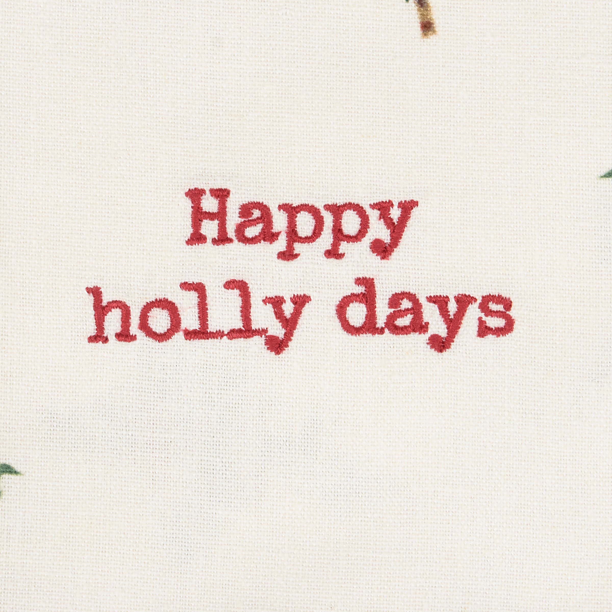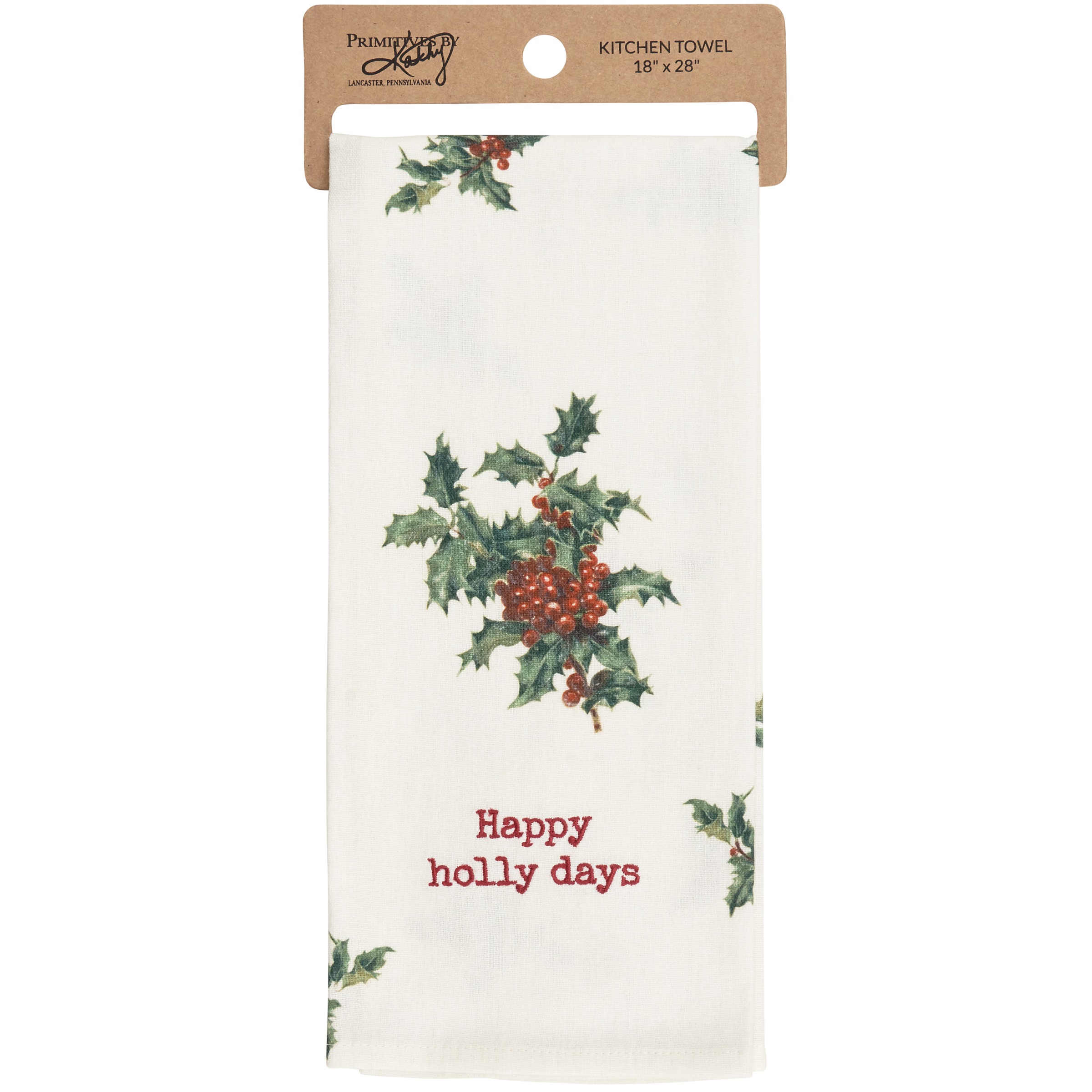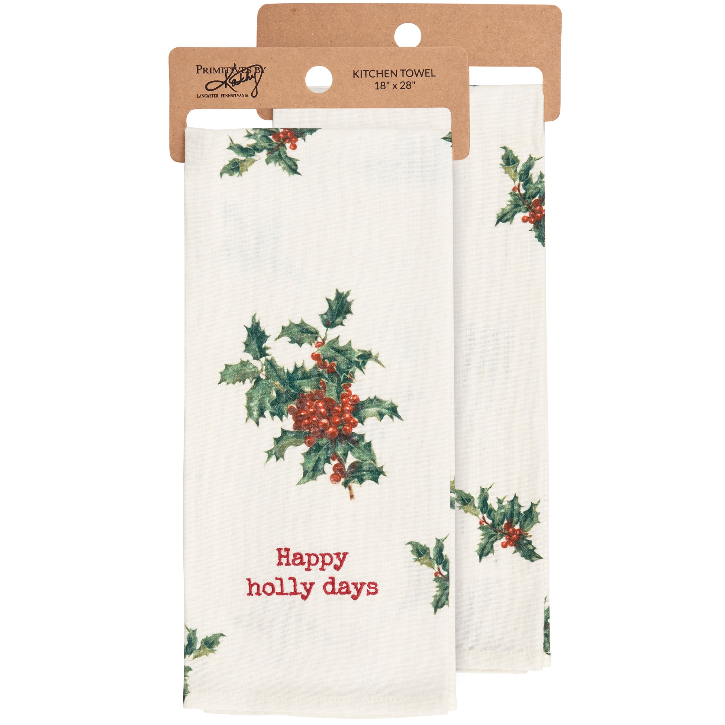 A cotton-linen kitchen towel from our Christmas Collection displaying all-over vintage designs of holly berries with a coordinating Christmas inspired pun that reads "Happy Holly Days." Sentiment is embroidered for added interest. Our Holly Days kitchen towel is conveniently machine-washable for easy cleaning. Seasonal kitchen towel is packaged on a cardboard hanger with hole to easily display on rack. A fun Christmas-themed kitchen accessory perfect for seasonal use.