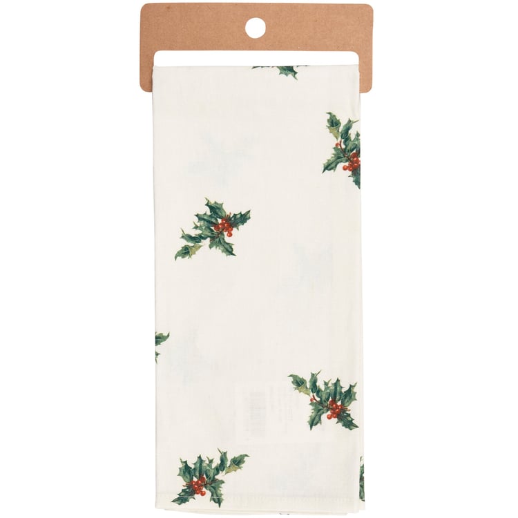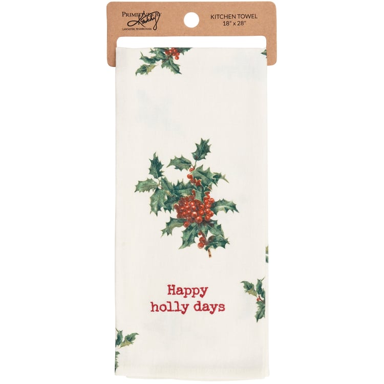 A cotton-linen kitchen towel from our Christmas Collection displaying all-over vintage designs of holly berries with a coordinating Christmas inspired pun that reads "Happy Holly Days." Sentiment is embroidered for added interest. Our Holly Days kitchen towel is conveniently machine-washable for easy cleaning. Seasonal kitchen towel is packaged on a cardboard hanger with hole to easily display on rack. A fun Christmas-themed kitchen accessory perfect for seasonal use.