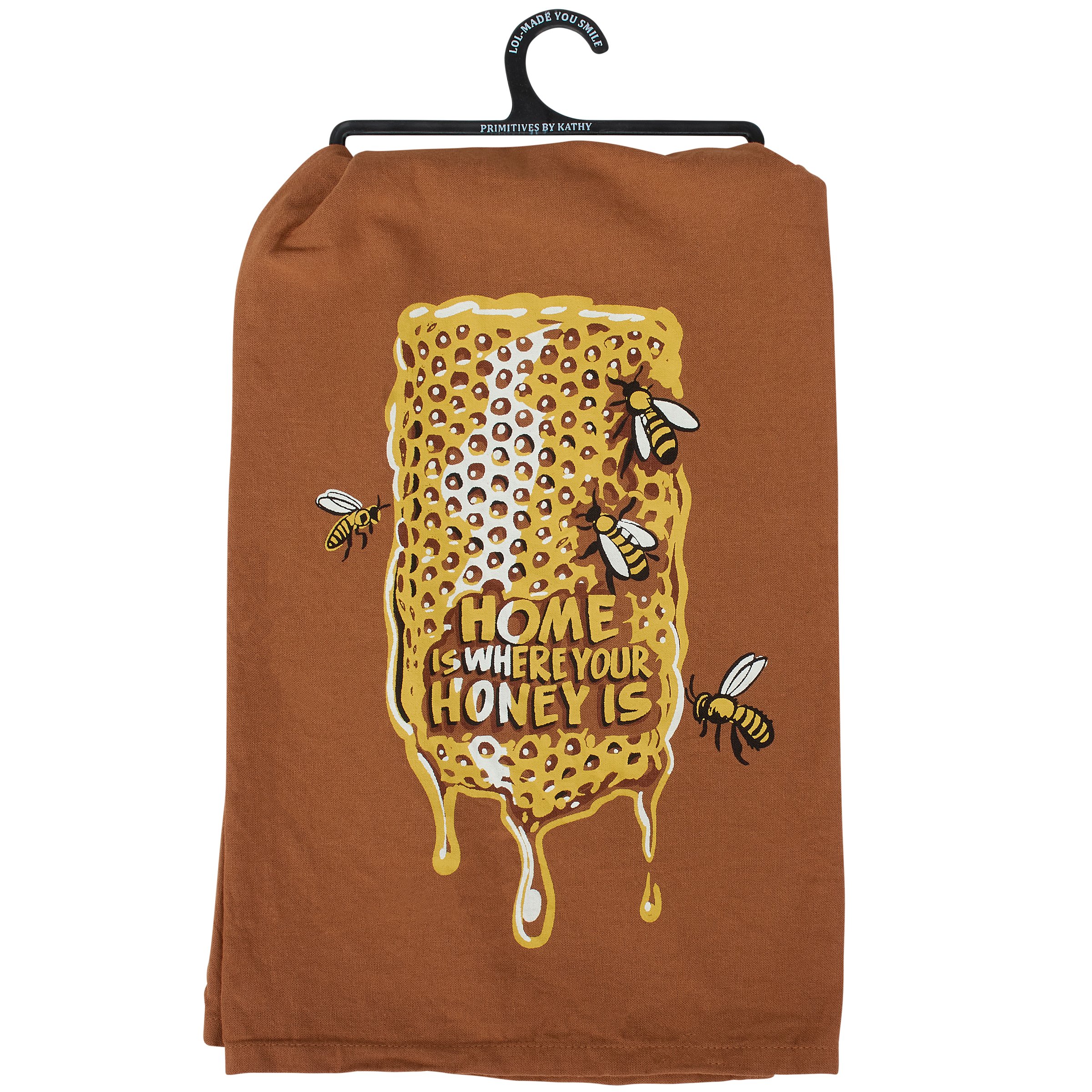A brown cotton kitchen towel from our Homestead Collection displaying a playful hand illustrated design of a honeycomb and honey bees with a fun bee inspired sentiment that reads "Home Is Where Your Honey Is." Our Home Is Where Your Honey Is kitchen towel is conveniently machine-washable for easy cleaning. This homestead kitchen towel is packaged on a black plastic hanger to easily display on rack. A fun homestead-themed gift perfect for adding personality to any kitchen while showing off their DIY lifestyle.