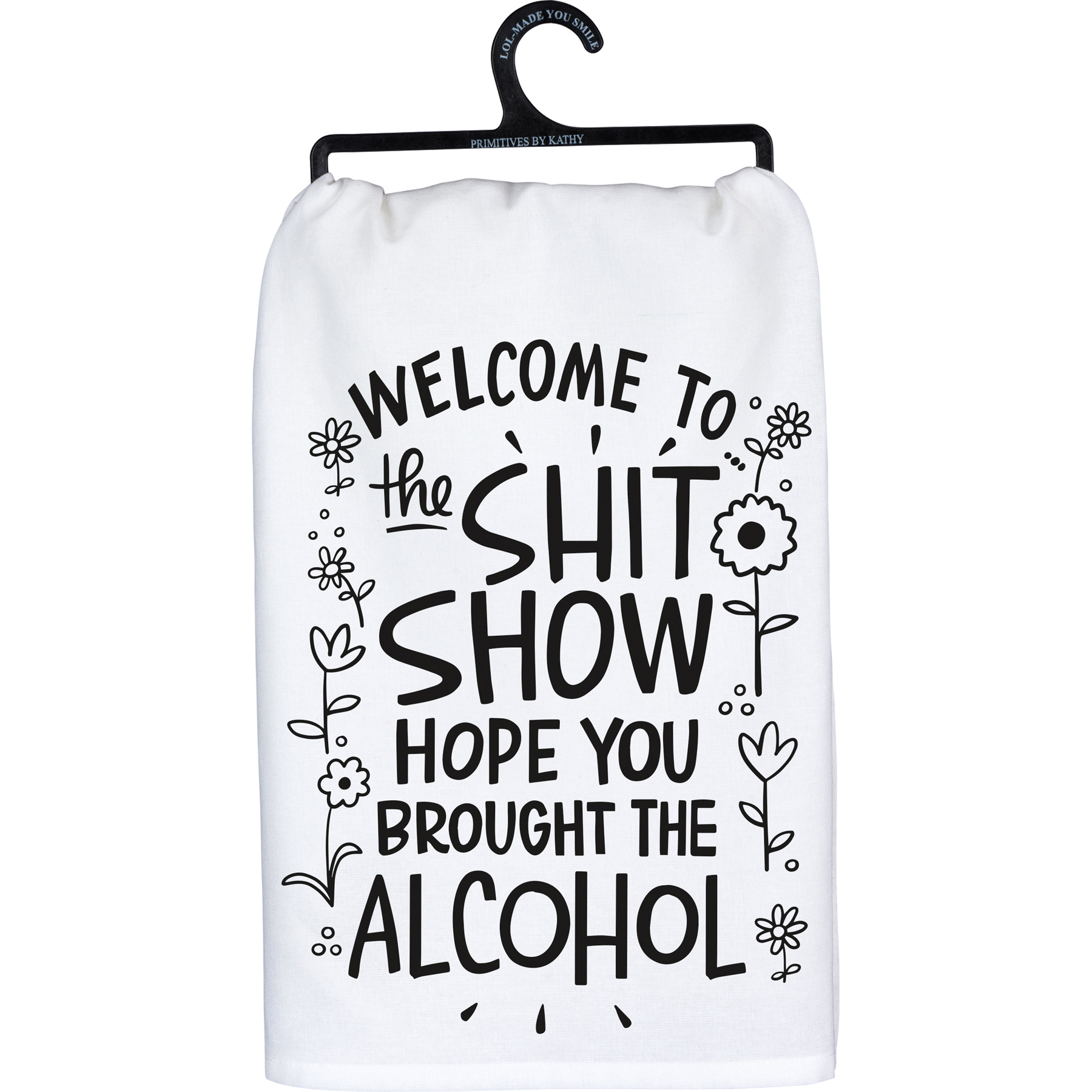 A black and white cotton kitchen towel from our LOL Made You Smile Collection displaying beautiful hand illustrated flower designs with humorous sentiment that reads "Welcome To The Shit Show - Hope You Brought The Alcohol." Our Hope You Brought Alcohol kitchen towel is machine-washable for convenient cleaning. Packaged on a black plastic hanger to easily display on rack. A fun and functional everyday kitchen accent.