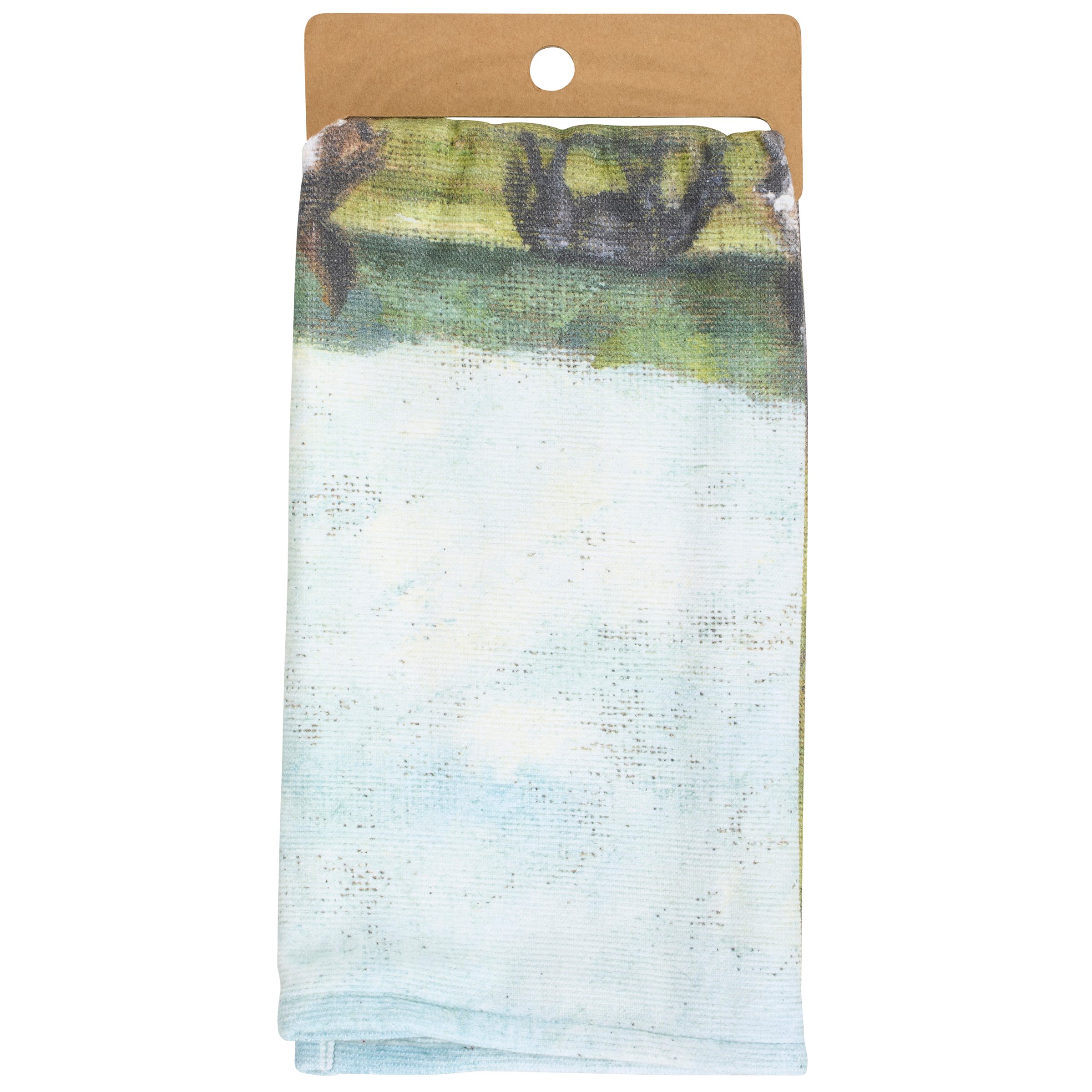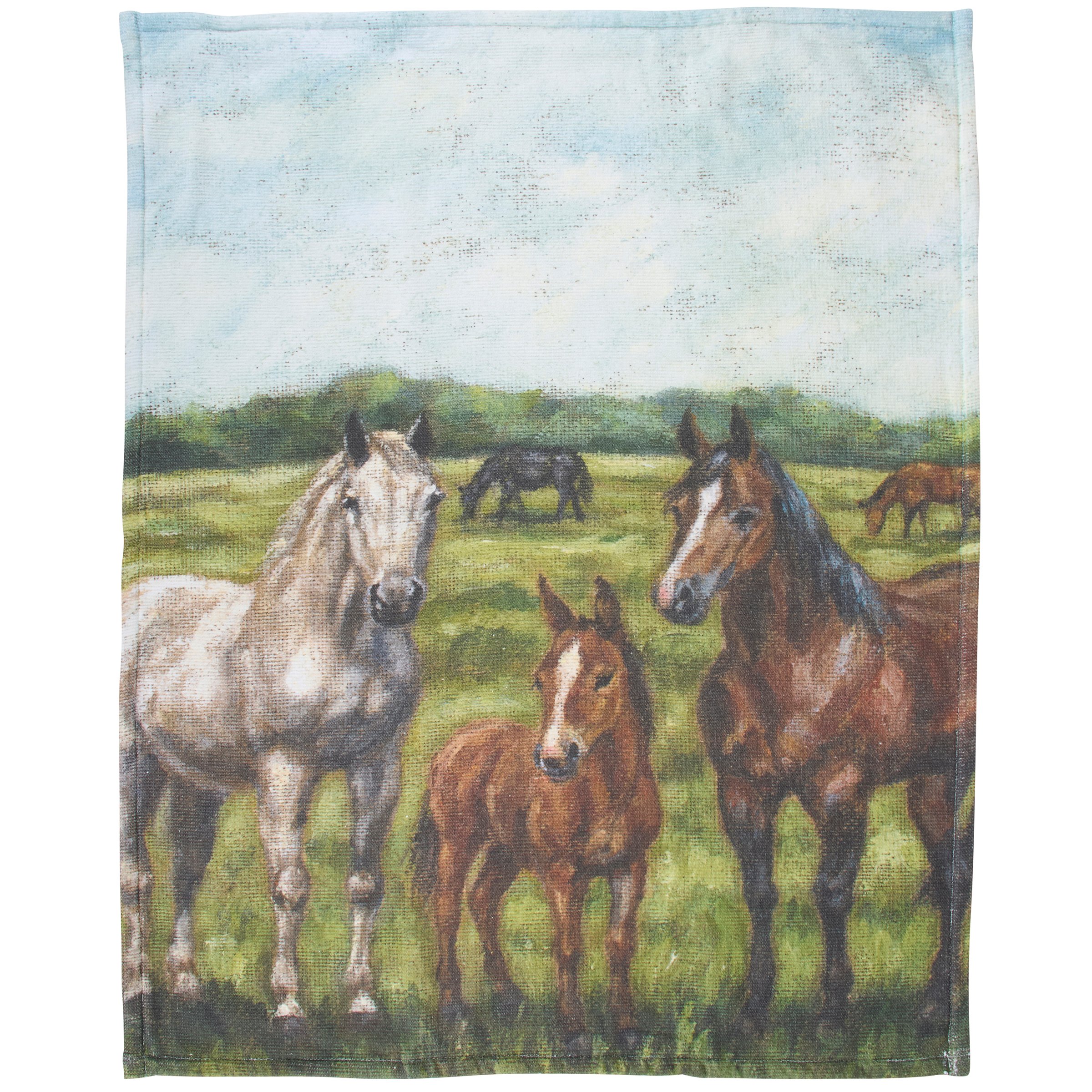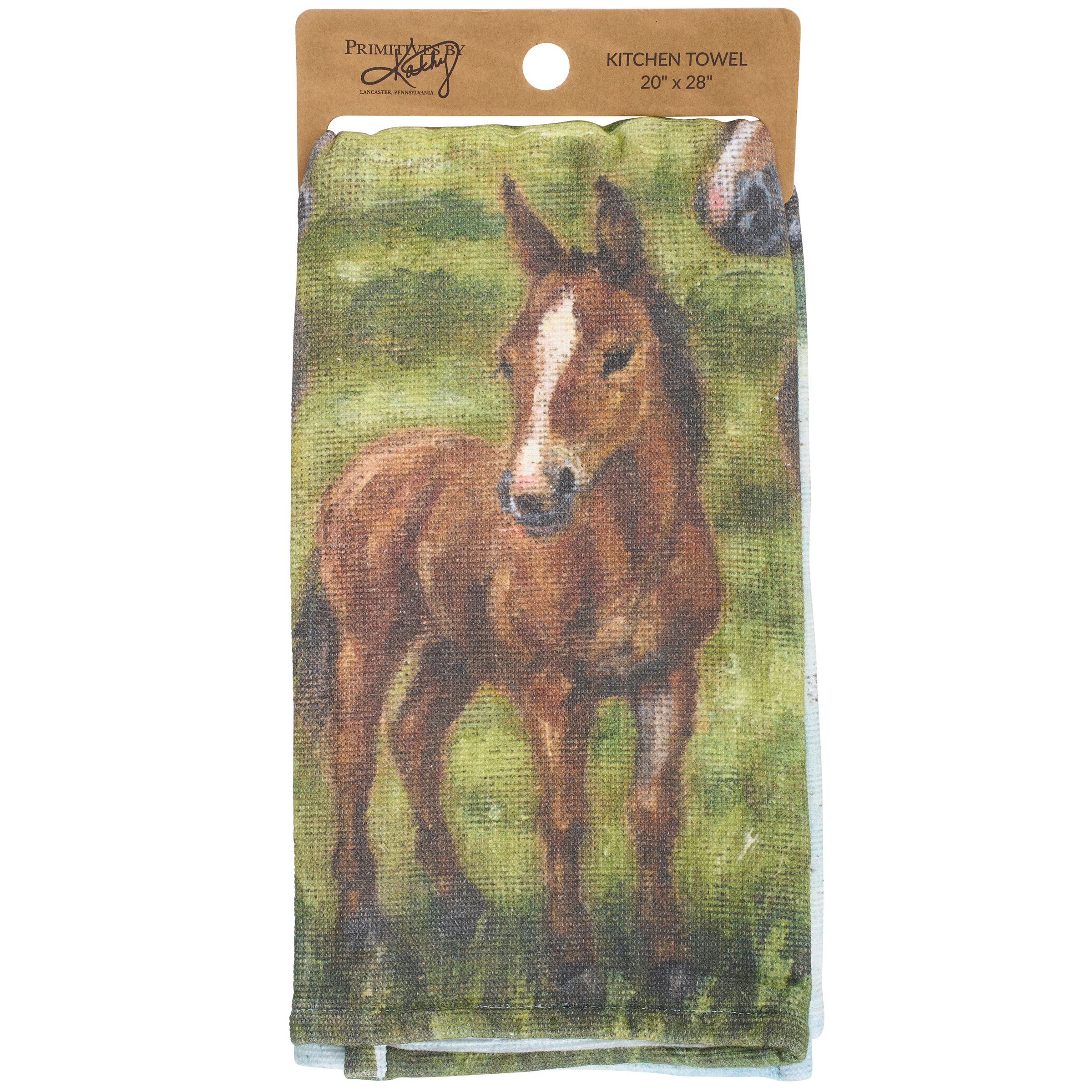 A microfiber kitchen towel from our Western Collection featuring an all-over design displaying a charming scene of a family of horses in a field. Horses design is replicated from original artwork painted onto burlap canvas, giving the art a unique depth and texture. Our Horse Family kitchen towel is conveniently machine-washable for easy cleaning. Western kitchen towel is packaged on a cardboard hanger with hole to easily display on rack. A western themed kitchen accessory perfect for everyday use.