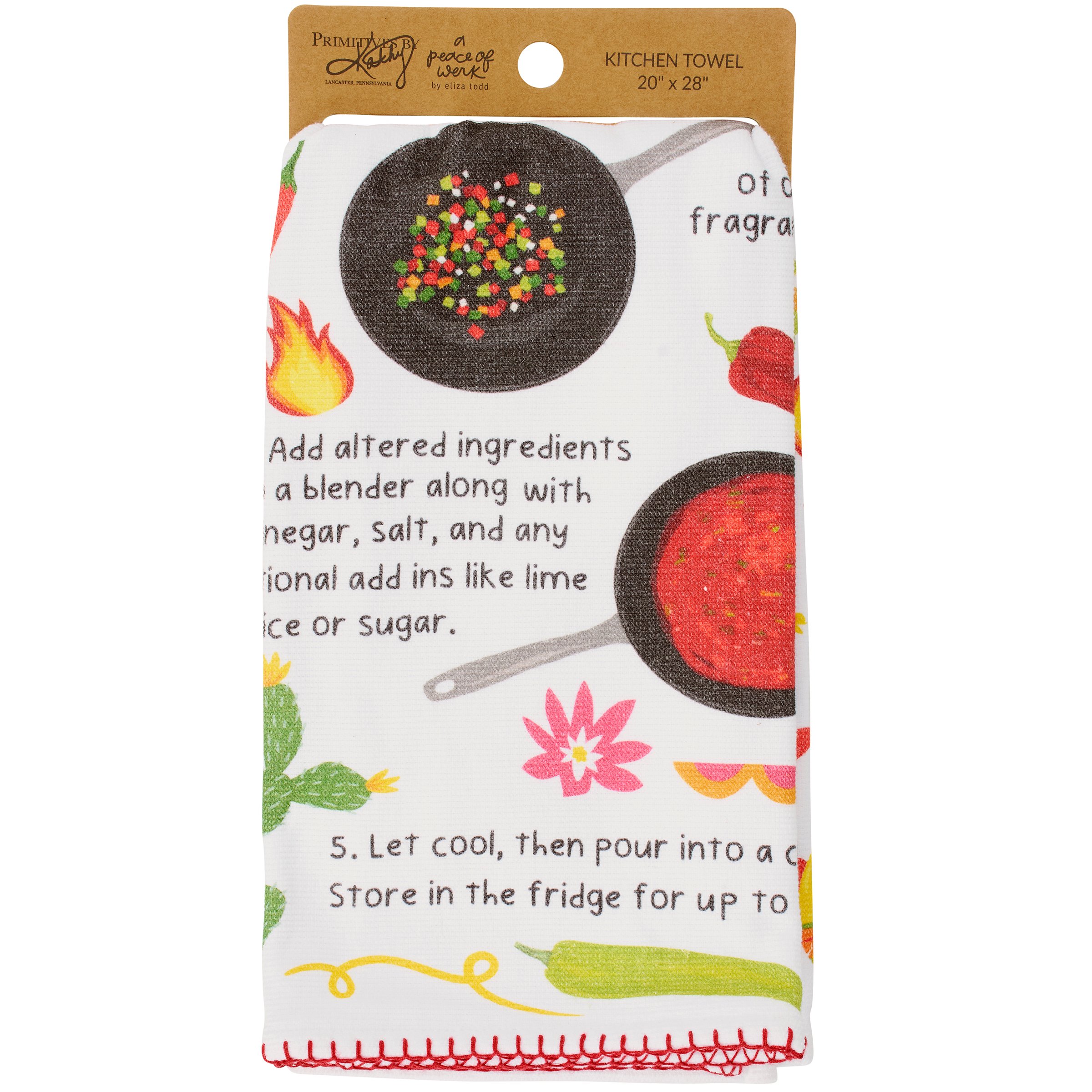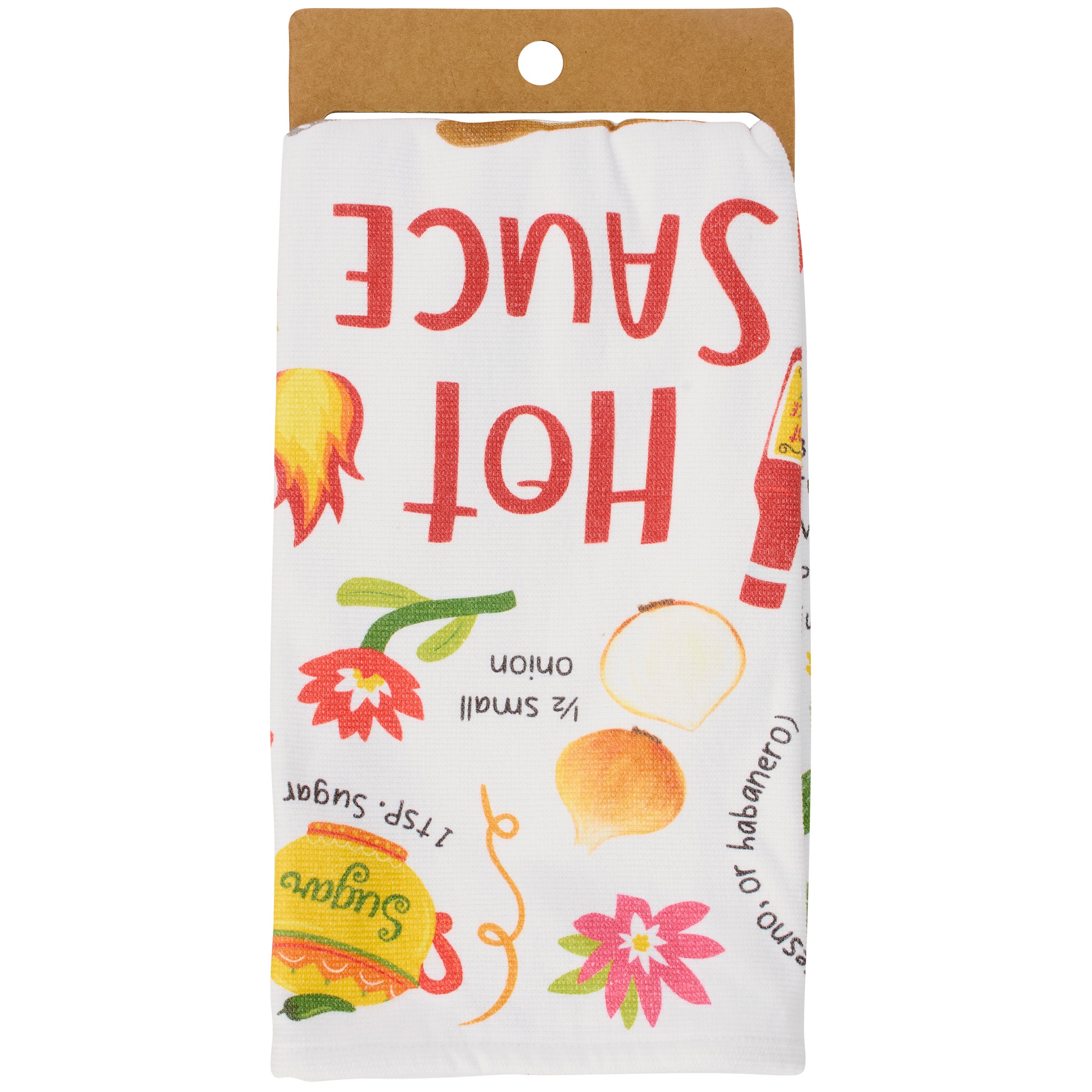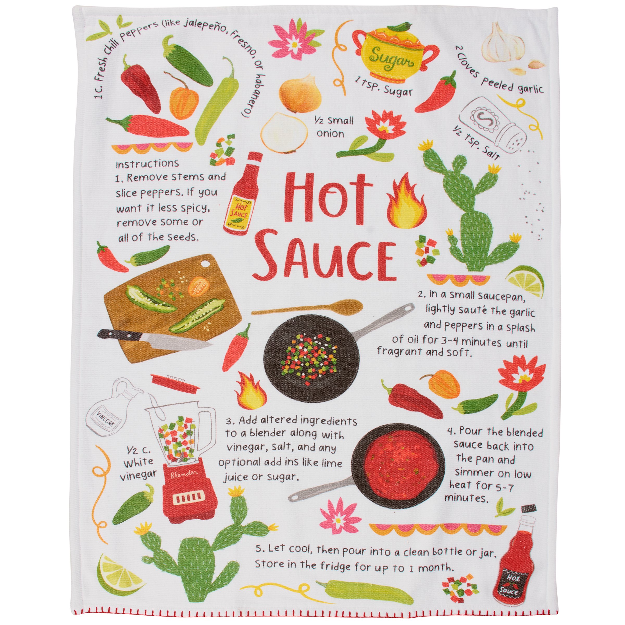 A cotton kitchen towel from our Homestead Collection displaying a fun recipe inspired all-over design replicated from original hand illustrated art. Homestead recipe design features instructions for making homemade hot sauce with coordinating illustrations. Hot sauce recipe is printed on textured slub fabric with a complementing red hem stitch at the bottom. Recipe kitchen towel features a terrycloth layer on the back for added absorbency and corner loop for hanging. Our Hot Sauce Recipe kitchen towel is conveniently machine-washable for easy cleaning. Kitchen towel is packaged on a cardboard hanger with hole to easily display on rack. A fun recipe themed gift perfect for an everyday kitchen accessory.