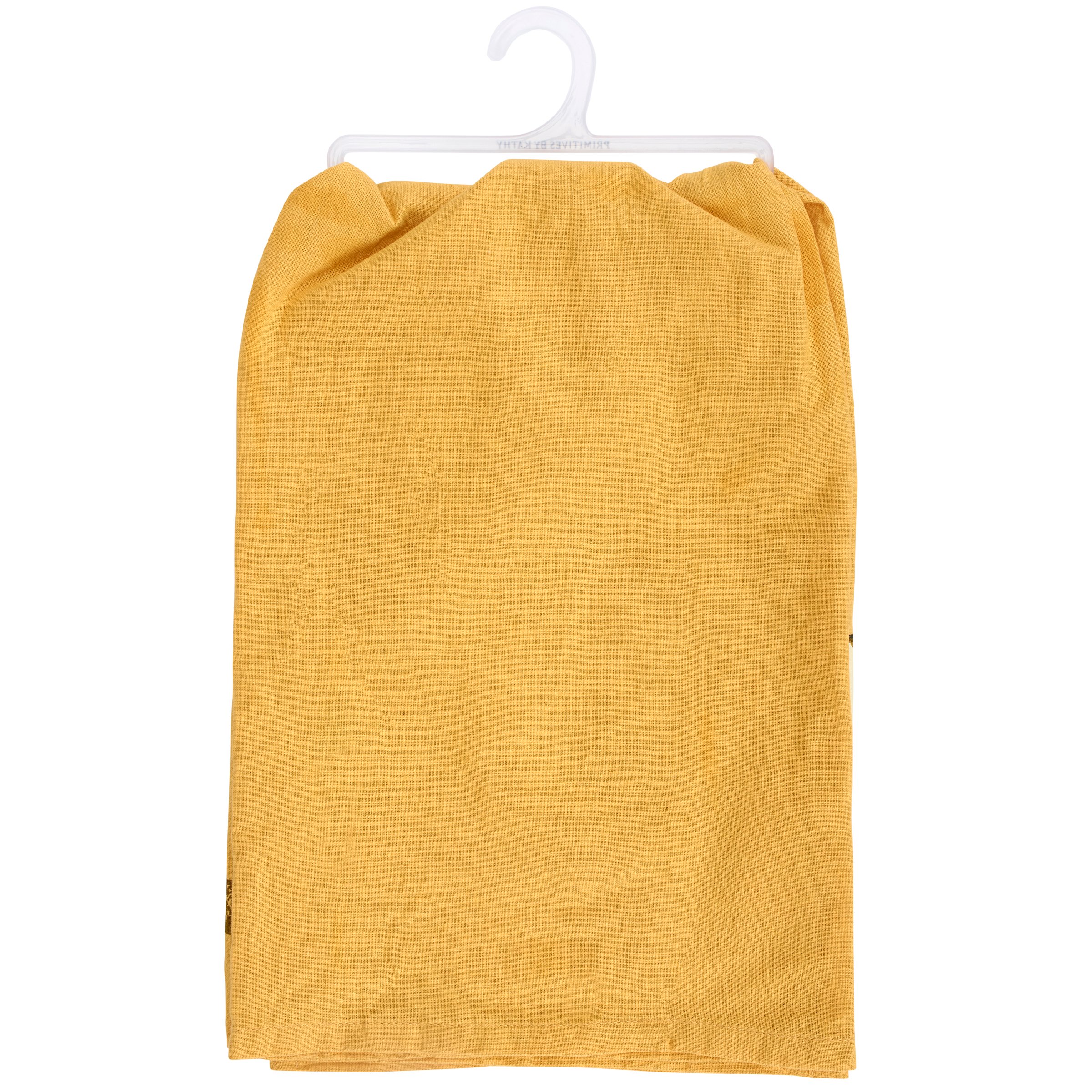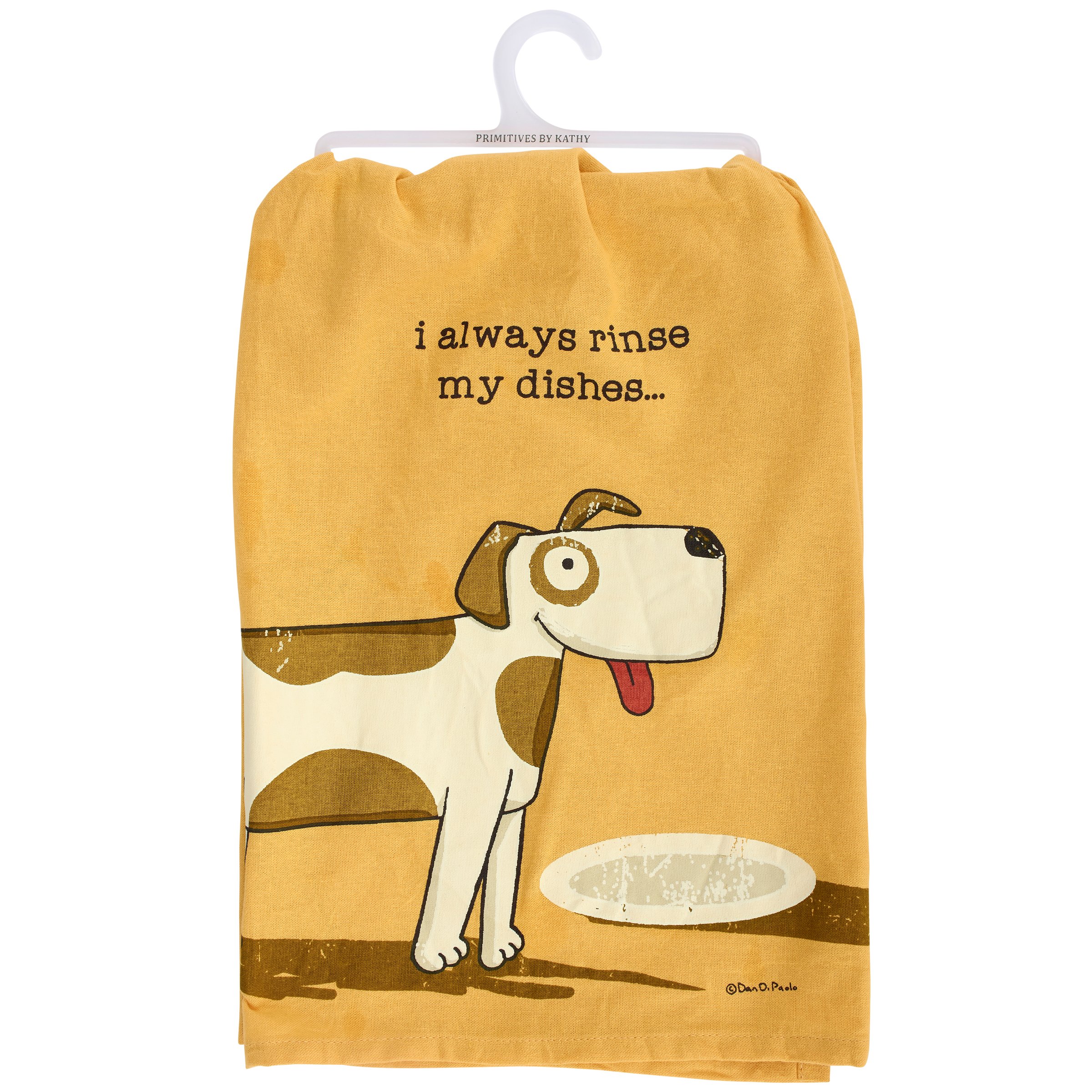 A yellow cotton kitchen towel from our Pet Collection displaying a rustic design of a happy dog with its tongue hanging out next to an empty plate on the floor with a fun dog themed sentiment that reads "I Always Rinse My Dishes..." Our I Always Rinse My Dishes kitchen towel is conveniently machine-washable for easy cleaning. Pet kitchen towel is packaged on a clear plastic hanger to easily display on rack. A fun dog themed gift perfect for adding personality to any kitchen while showing off a love for pets.