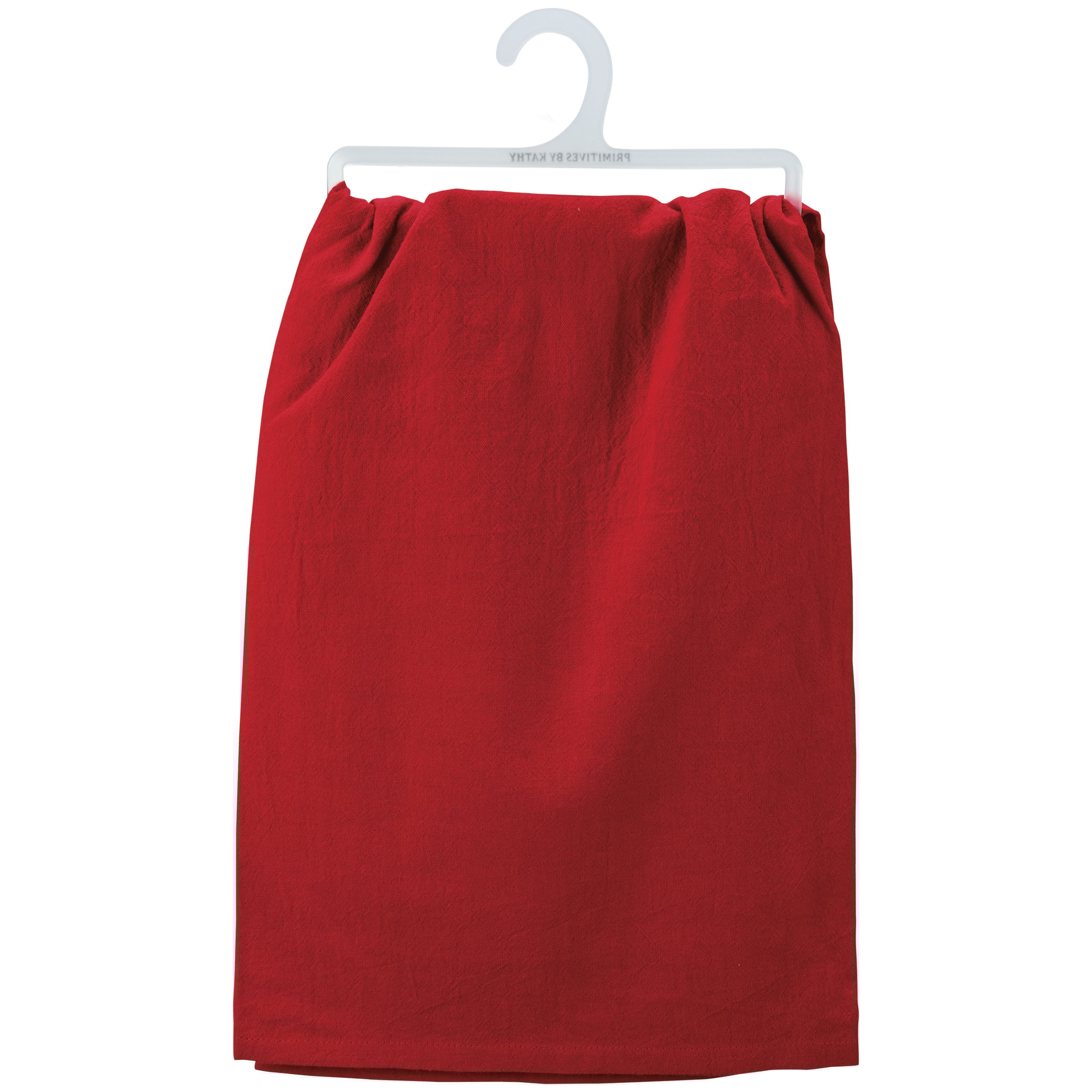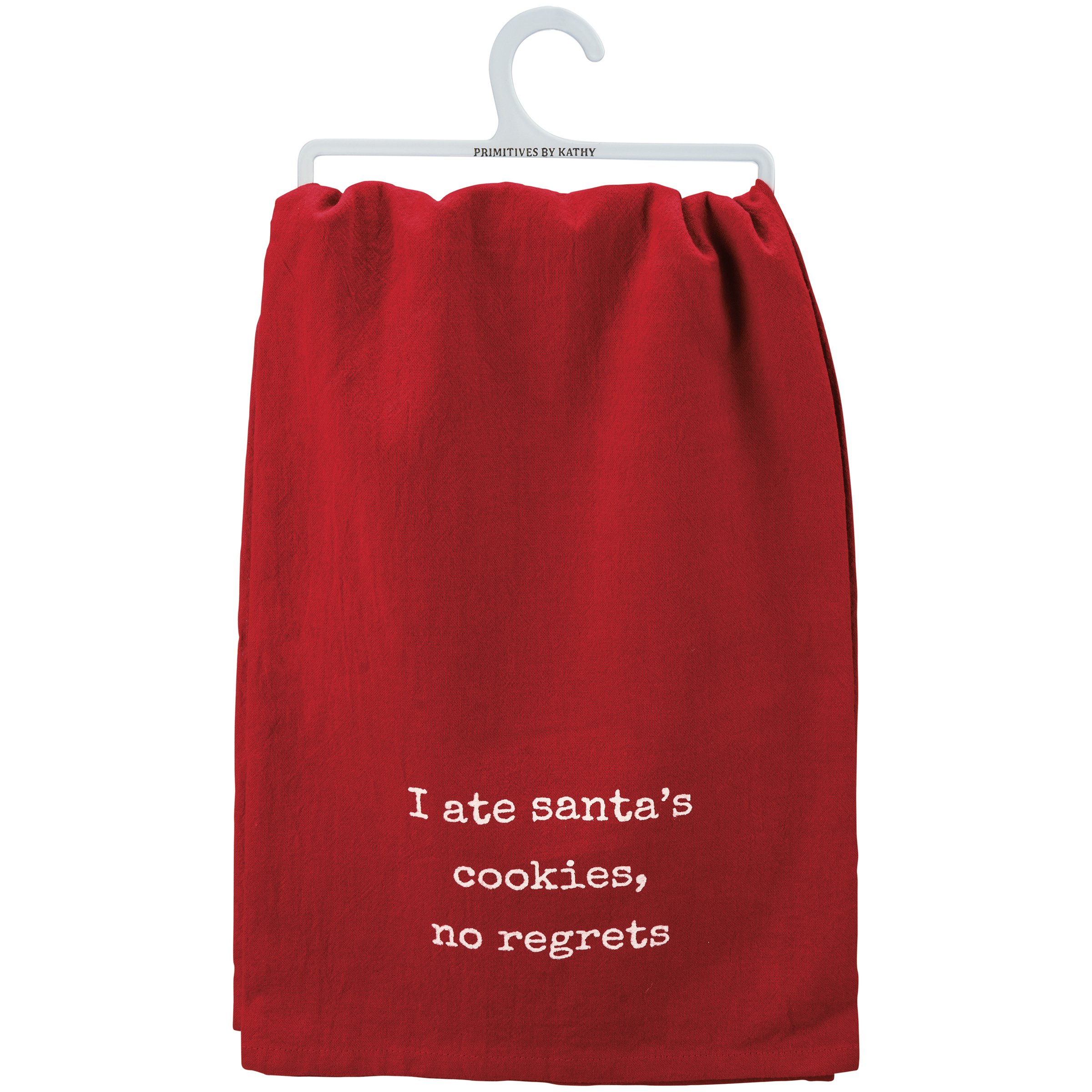 A red cotton kitchen towel featuring a typeset "I Ate Santa's Cookies, No Regrets" sentiment. Our No Regrets kitchen towel is machine-washable.