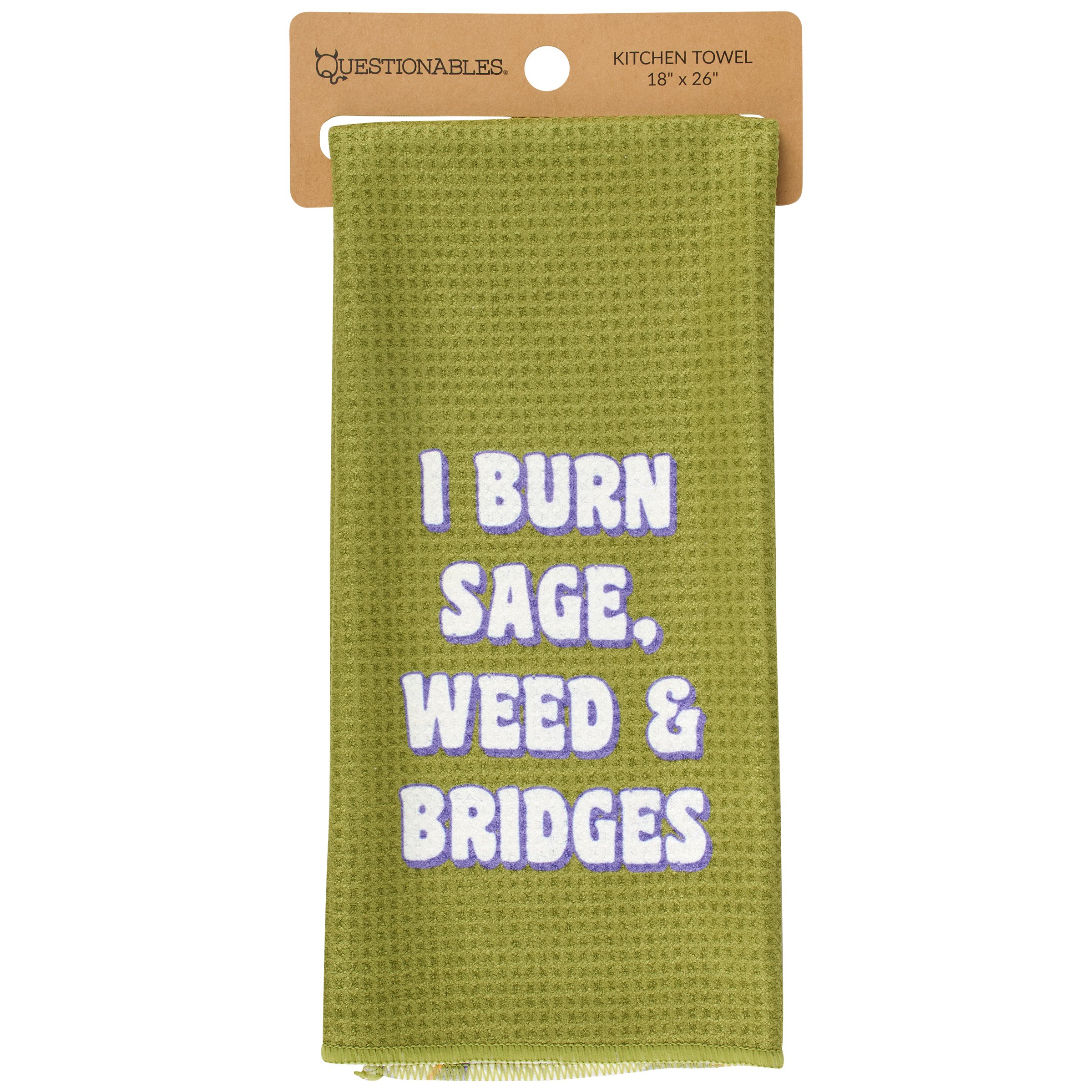 Sassy sentiment on one side, fun pattern on the other. This absorbent and quick drying microfiber towel offers multiple display options to fit the current mood. When feeling feisty, display the "I Burn Sage, Weed, & Bridges" sentiment or flip to flaunt the pot leaf pattern for chill vibes. Questionables kitchen towels are conveniently machine washable for stress-free cleaning. Packaged on a carboard hanger with hole for easy store rack display. Our I Burn Sage, Weed, & Bridges kitchen towel demands attention and is perfect for everyday expression or gifting to like-minded friends.