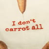 A cotton linen blend kitchen towel featuring all-over retro style carrot designs and punny embroidered "I Don't Carrot All" sentiment. Features a cotton tape loop in the corner for easy hanging. Machine-washable. Towel is packaged on a cardboard hanger with a hole to easily hang on rack.