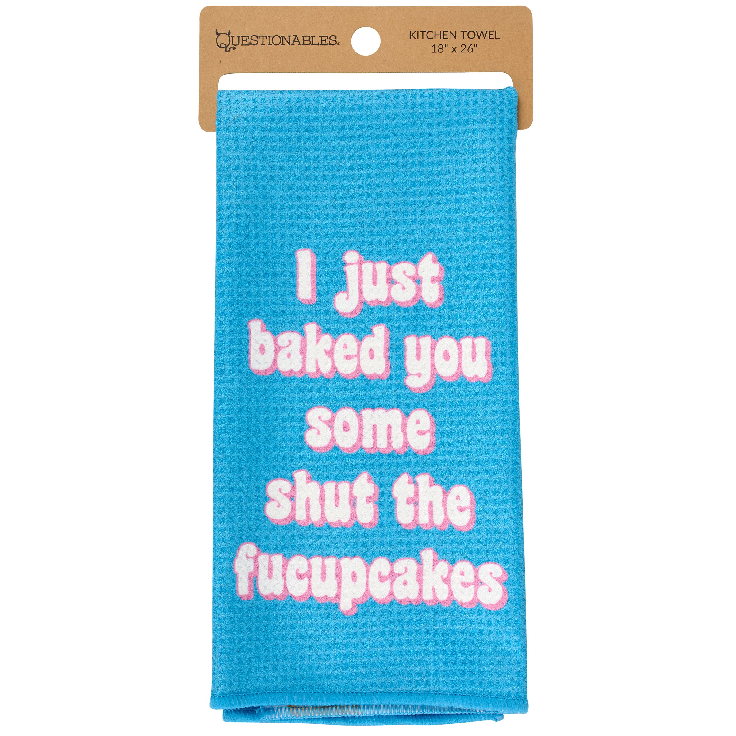 Sassy sentiment on one side, fun pattern on the other. This absorbent and quick drying microfiber towel offers multiple display options to fit the current mood. When feeling feisty, display the "I Just Baked You Some Shut The Fucupcakes" sentiment or flip to flaunt the colorful cupcakes and hearts pattern for fun vibes. Questionables kitchen towels are conveniently machine washable for stress-free cleaning. Packaged on a carboard hanger with hole for easy store rack display. Our I Just Baked You Some kitchen towel demands attention and is perfect for everyday expression or gifting to like-minded friends.