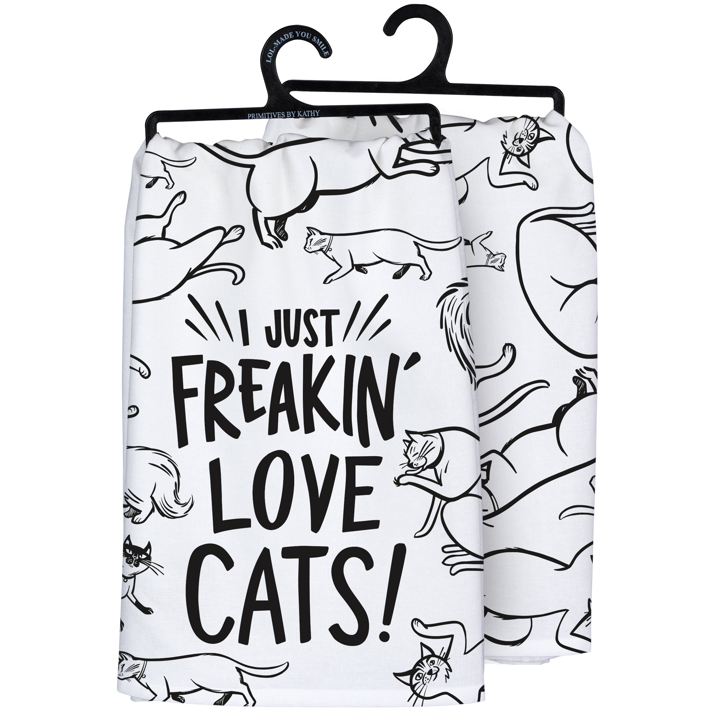 A black and white cotton kitchen towel featuring "I Just Freakin' Love Cats!" sentiment and all-over cat designs. Machine-washable.