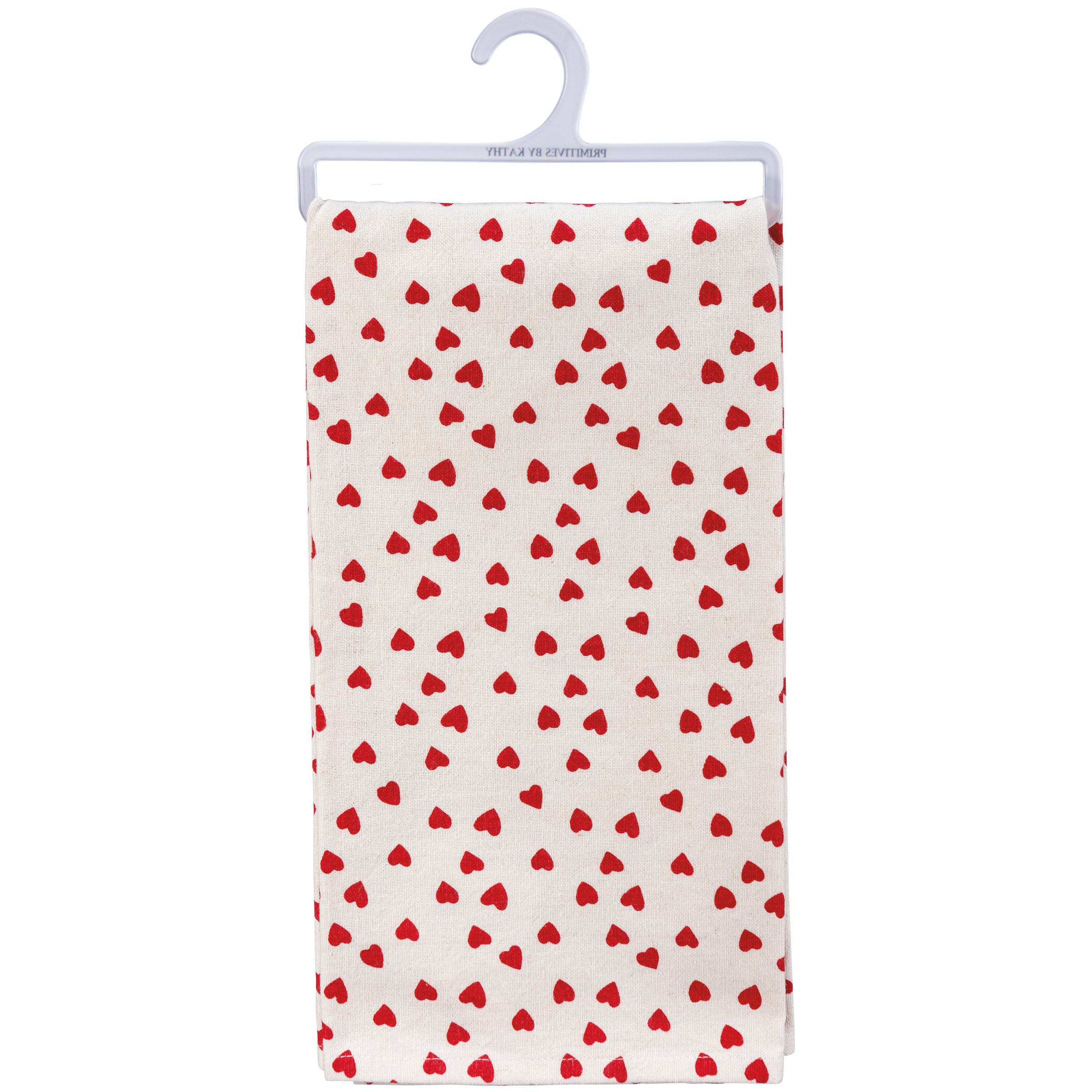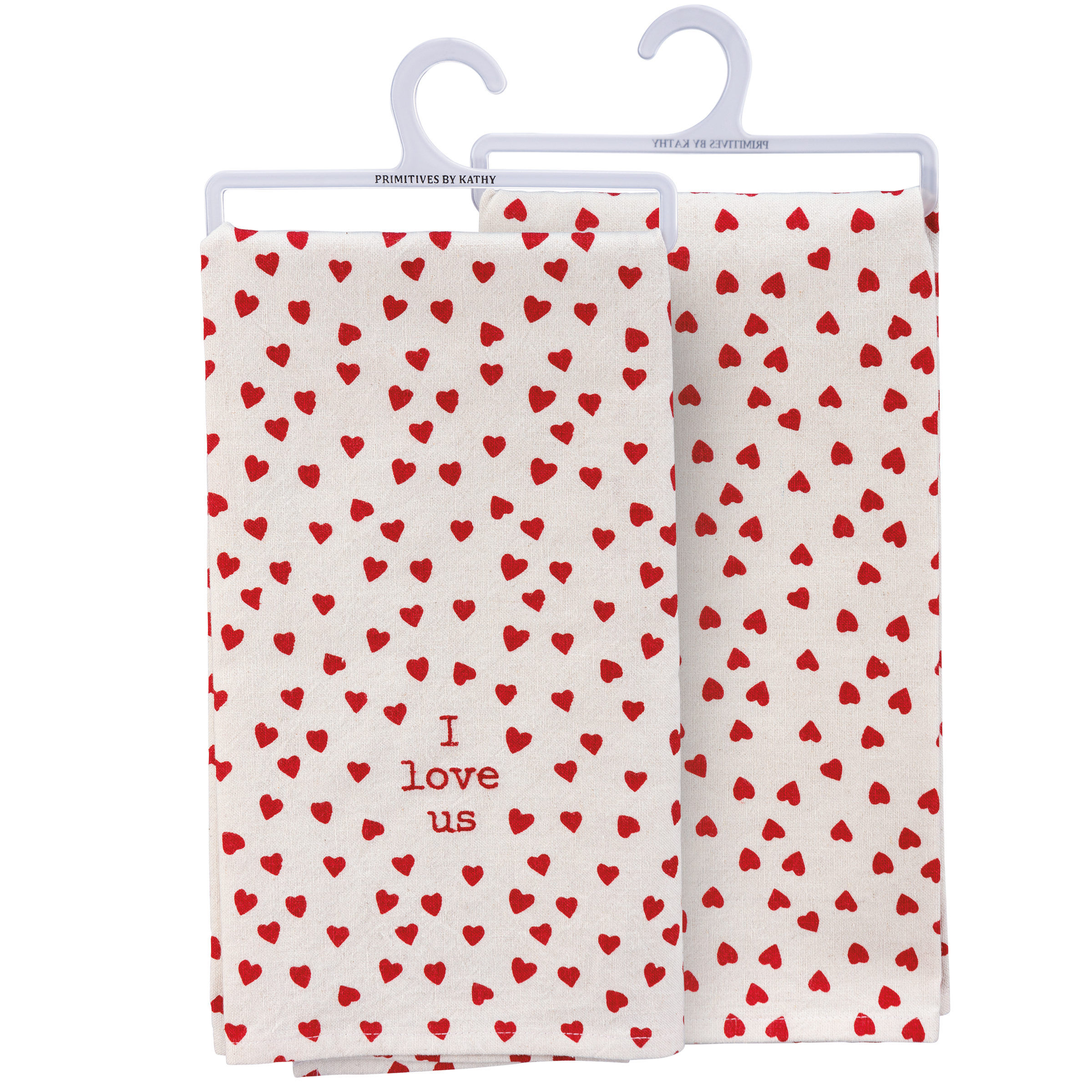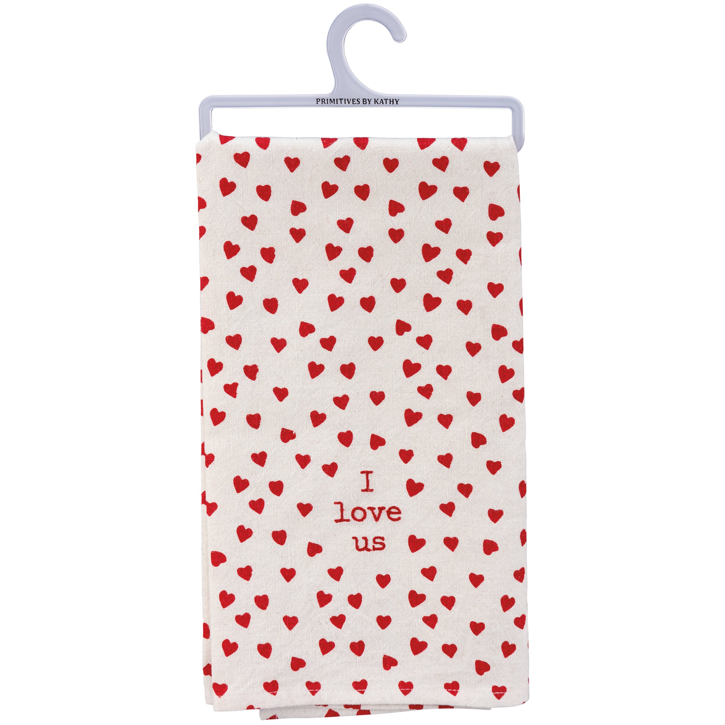 A cotton linen blend kitchen towel featuring an all-over heart design with embroidered "I Love Us" sentiment. Machine-washable.