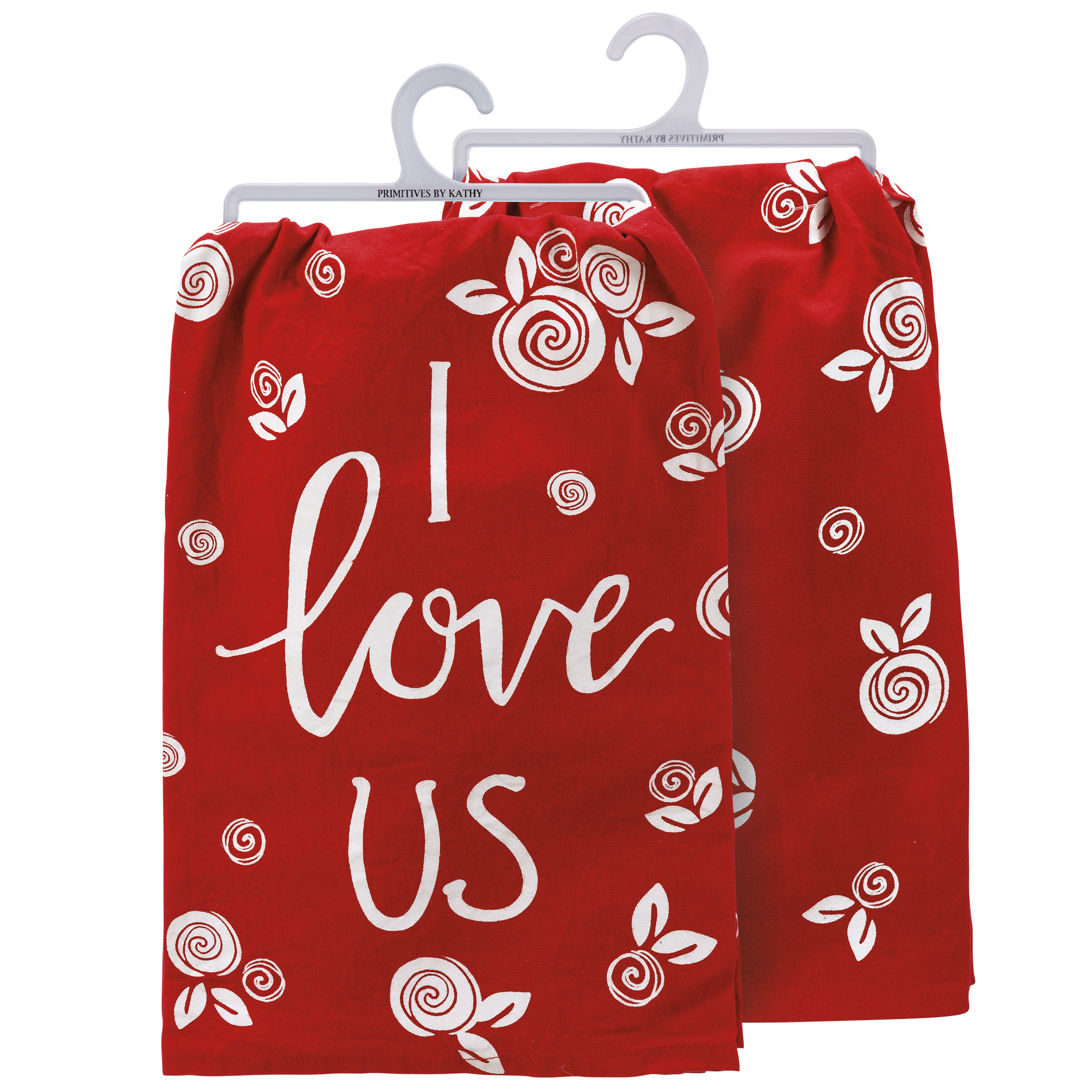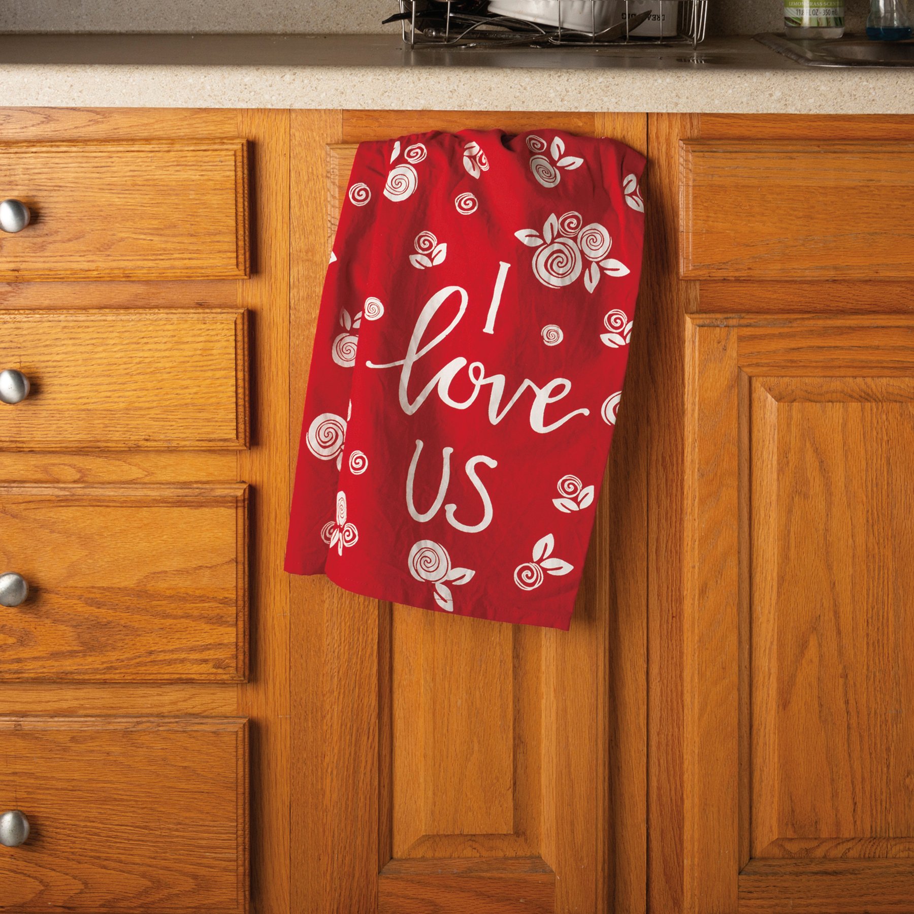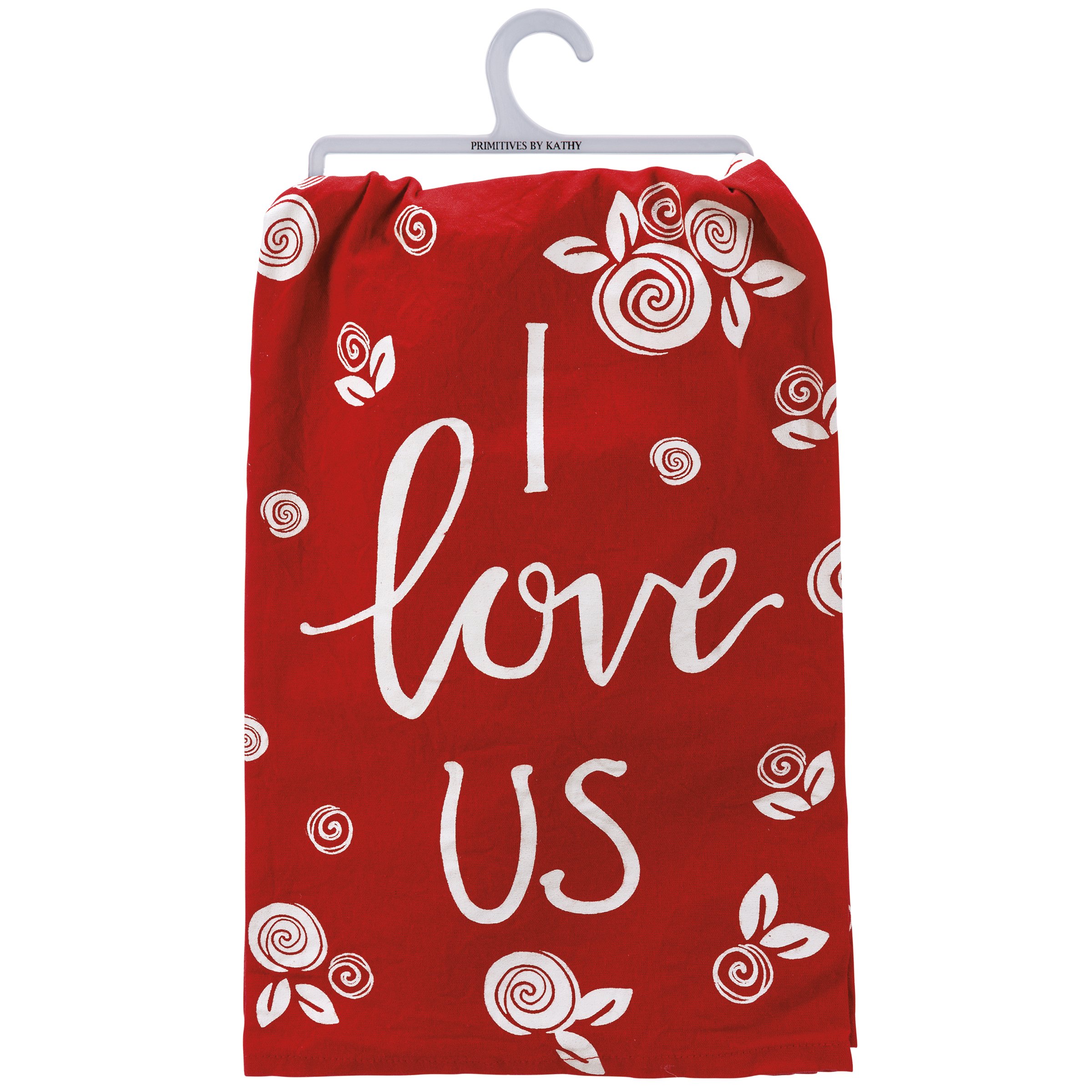 A cotton kitchen towel featuring an all-over floral design with hand lettered "I Love Us" sentiment. Our I Love Us kitchen towel is machine-washable.