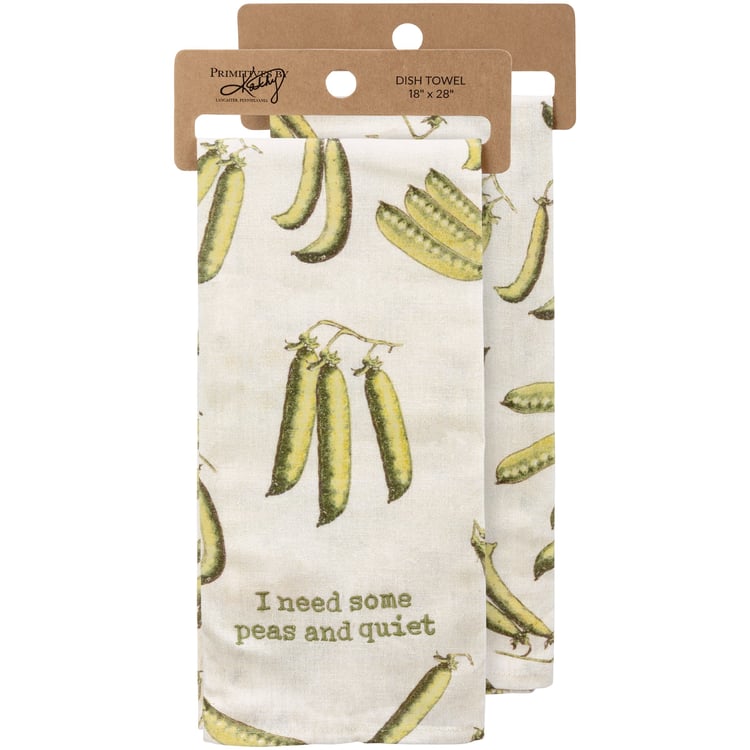A cotton linen blend kitchen towel featuring all-over retro style pea pod designs and punny embroidered "I Need Some Peas And Quiet" sentiment. Features a cotton tape loop in the corner for easy hanging. Machine-washable. Towel is packaged on a cardboard hanger with a hole to easily hang on rack.