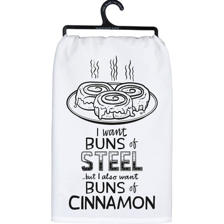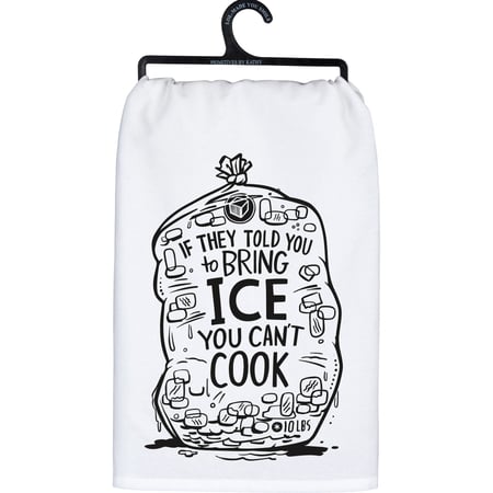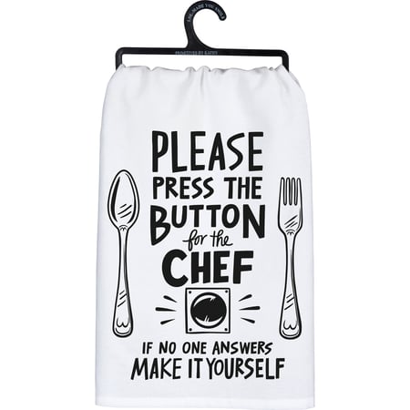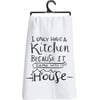 A black and white cotton kitchen towel lending a hand lettered "I Only Have A Kitchen Because It Came With The House" sentiment with home design that complements well with existing kitchen decor. Machine-washable.