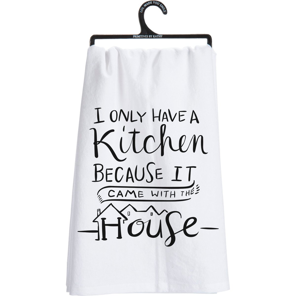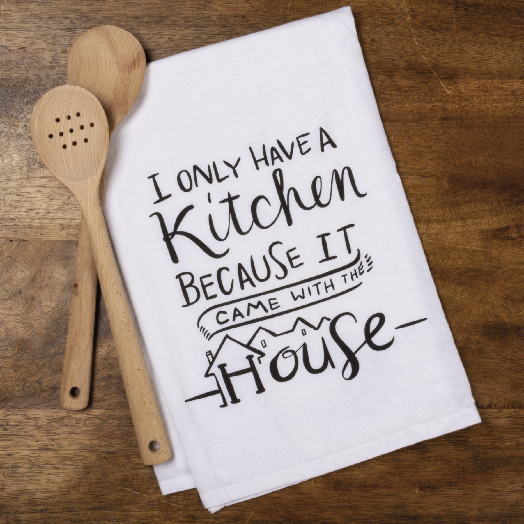 A black and white cotton kitchen towel lending a hand lettered "I Only Have A Kitchen Because It Came With The House" sentiment with home design that complements well with existing kitchen decor. Machine-washable.