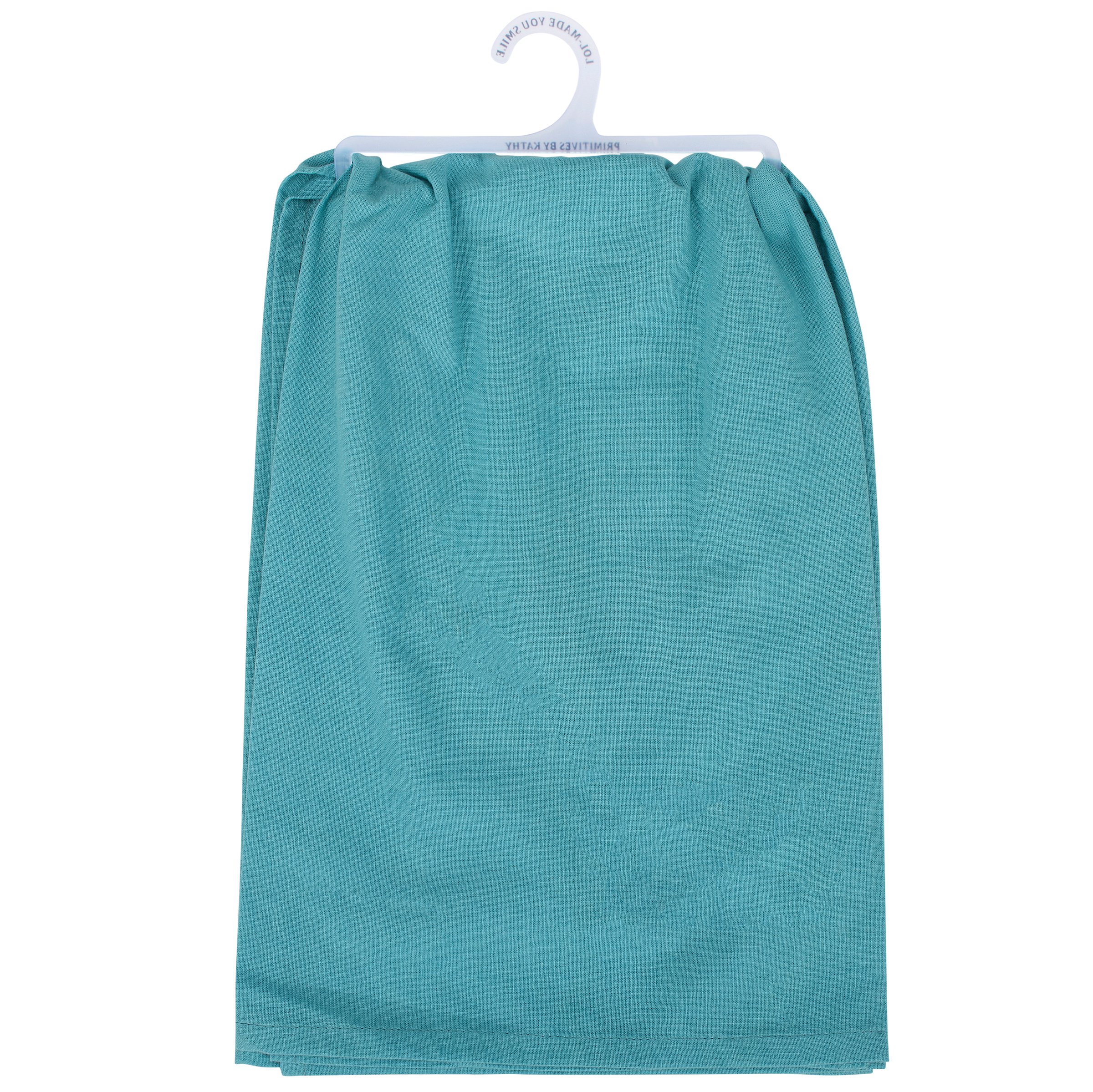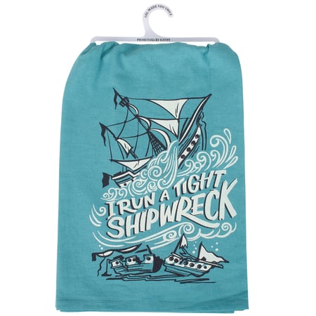 An ocean blue cotton kitchen towel from our Beach Collection displaying a hand illustrated scene of a ship on rough waves and a sunken ship with a fun sailing inspired sentiment that reads "I Run A Tight Shipwreck." Our I Run A Tight Shipwreck kitchen towel is conveniently machine-washable for easy cleaning. This beach kitchen towel is packaged on a white plastic hanger to easily display on rack. A fun beach-themed gift perfect for adding personality to any kitchen while showing off a love for the ocean.
