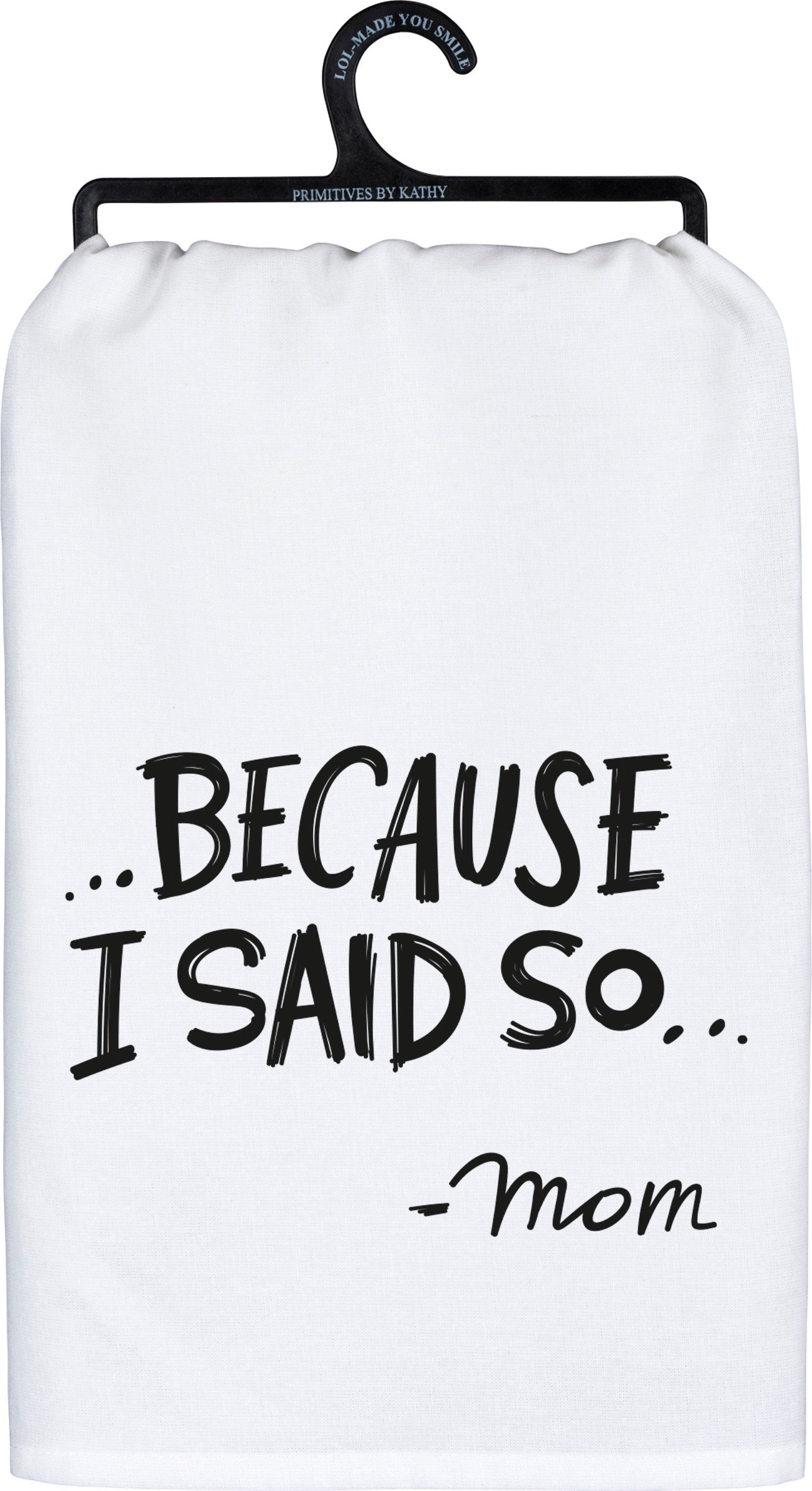 A black and white cotton kitchen towel featuring a "…Because I Said So… - Mom" sentiment. Machine-washable.