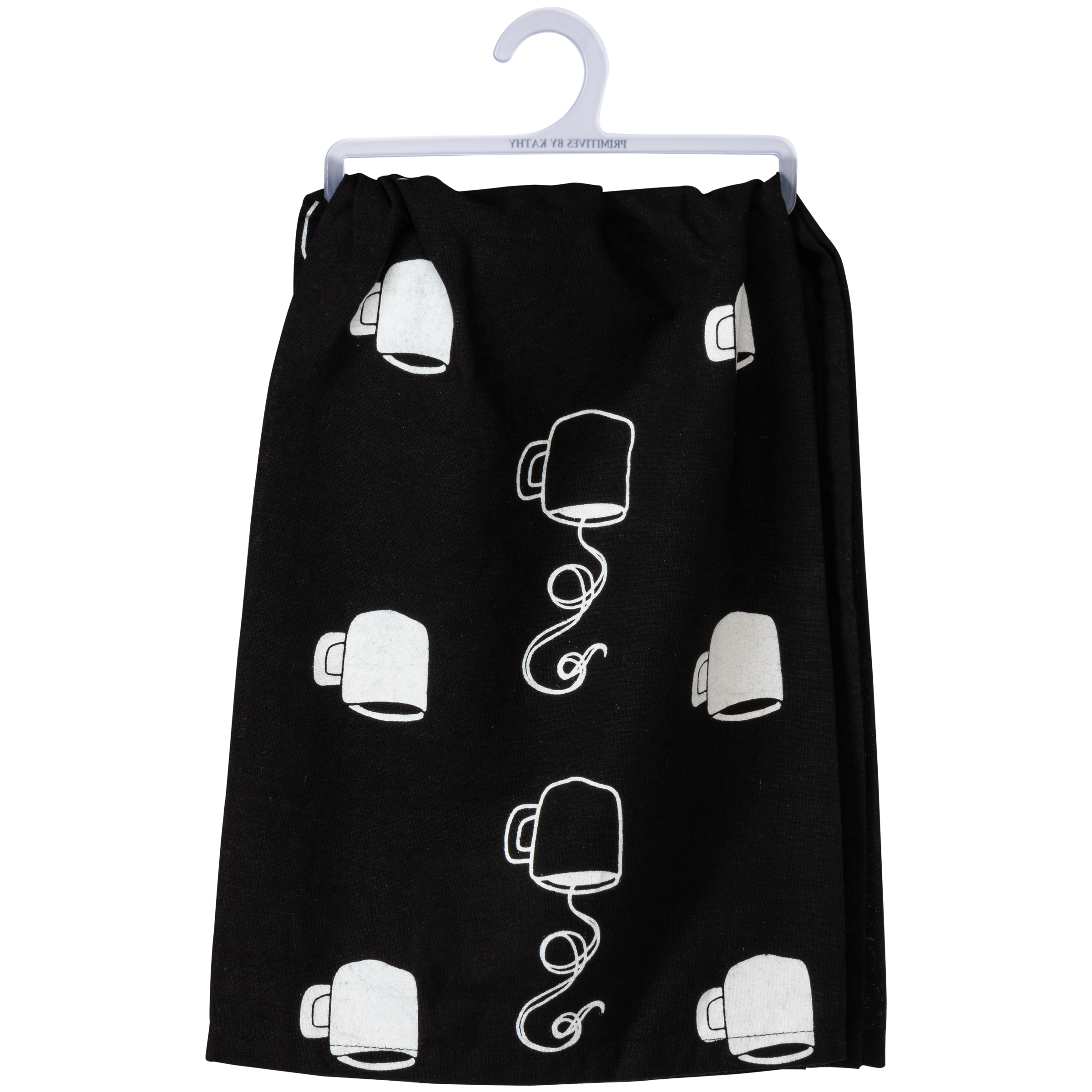 A black cotton kitchen towel featuring a hand lettered "How Do I Take My Coffee? Seriously Very Seriously" sentiment and coffee cup design. All-over print design. Machine-washable.