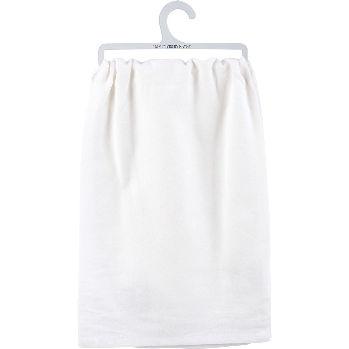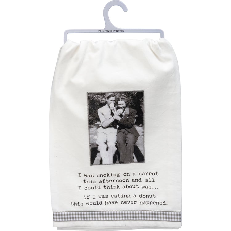 A cotton kitchen towel with a stitched art panel featuring an old fashioned black and white image, "I Was Choking On A Carrot This Afternoon And All I Could Think About Was…If I Was Eating A Donut This Never Would Have Happened." sentiment, and gingham ribbon trim. Machine-washable.