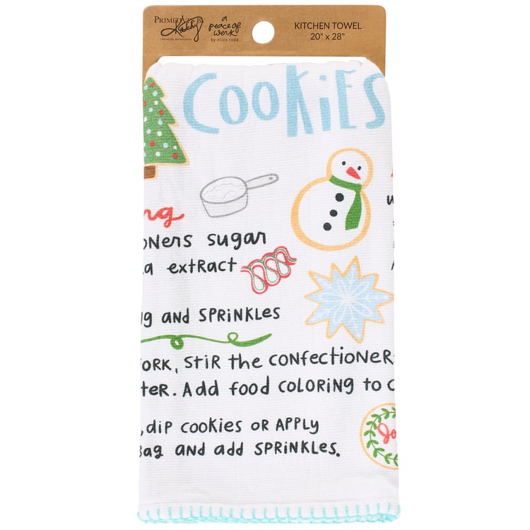 A cotton kitchen towel from our Christmas Collection displaying a fun recipe inspired all-over design replicated from original hand illustrated art. Christmas homestead recipe design features instructions for making homemade iced sugar cookies with coordinating illustrations. Iced sugar cookie recipe is printed on textured slub fabric with a coordinating blue hem stitch at the bottom. Seasonal recipe kitchen towel features a terrycloth layer on the back for added absorbency and corner loop for hanging. Our Iced Sugar Cookies kitchen towel is conveniently machine-washable for easy cleaning. Seasonal kitchen towel is packaged on a cardboard hanger with hole to easily display on rack. A fun homestead-themed Christmas gift perfect for a seasonal kitchen accessory.