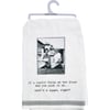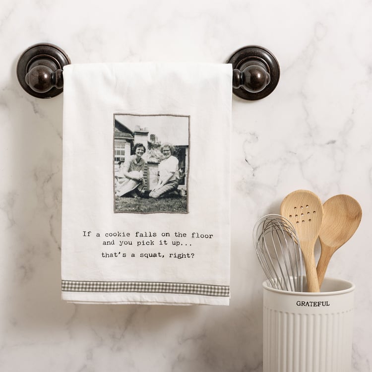 A cotton kitchen towel from our Trash Talk by Annie Collection features a stitched art panel featuring a vintage photograph, "If A Cookie Falls On The Floor And You Pick It Up…That's A Squat, Right?" sentiment, and gingham ribbon trim. Our Cookie Falls kitchen towel is machine-washable.