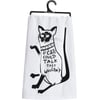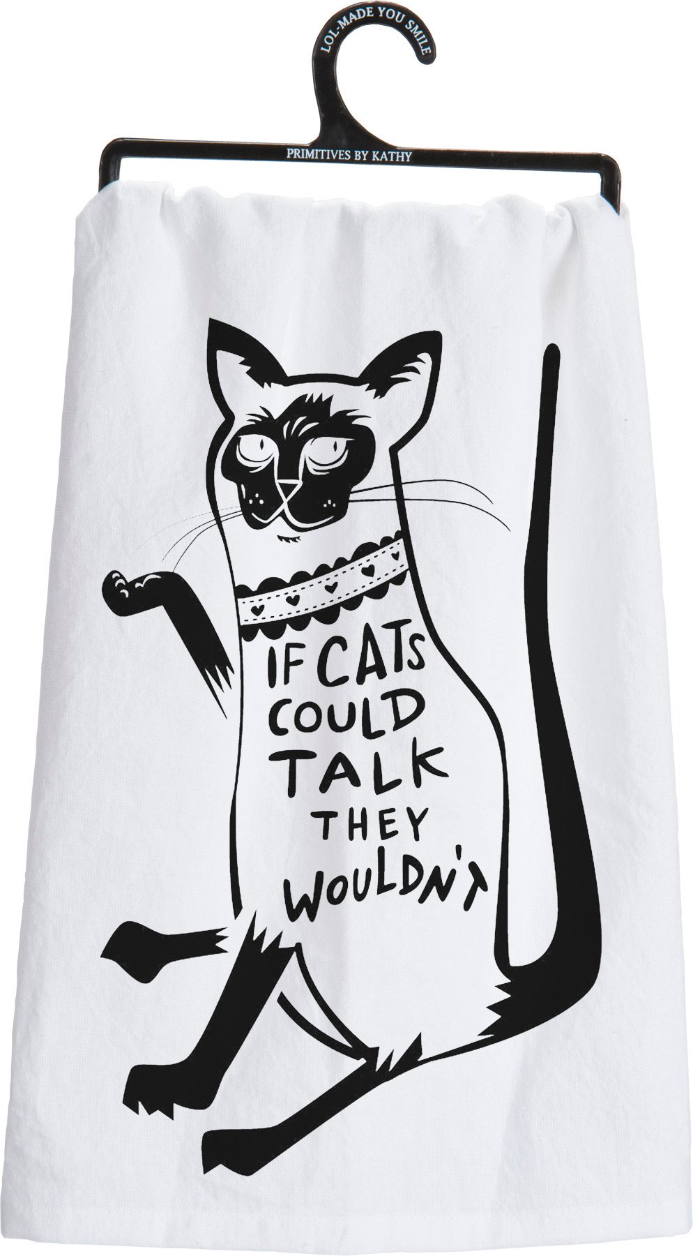 A black and white cotton kitchen towel lending a hand lettered "If Cats Could Talk They Wouldn't" sentiment with cat design that complements well with existing kitchen decor. Machine-washable.