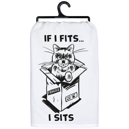 A black and white cotton kitchen towel from our Pet Collection displaying a fun hand illustrated design of a sassy cat in a shipping box with a humorous cat-themed sentiment that reads "If I Fits... I Sits." Our If I Fits I Sits kitchen towel is conveniently machine-washable for easy cleaning. Funny kitchen towel is packaged on a black plastic hanger to easily display on rack. A fun pet-themed gift perfect for an everyday kitchen accessory.