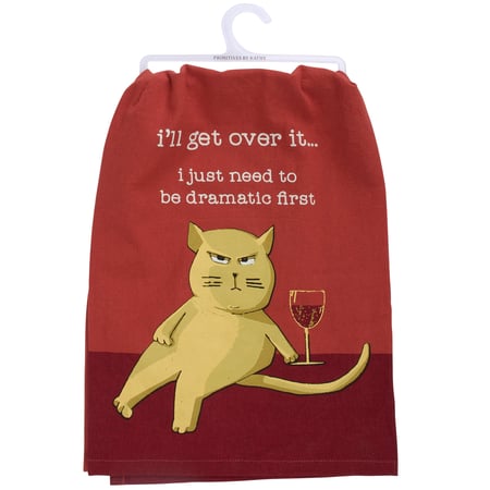 A red cotton kitchen towel from our Pet Collection displaying a rustic design of an angry cat with a glass of wine and a sassy sentiment that reads "I'll Get Over It... I Just Need To Be Dramatic First." Our I'll Get Over It kitchen towel is conveniently machine-washable for easy cleaning. Pet kitchen towel is packaged on a clear plastic hanger to easily display on rack. A fun cat themed gift perfect for adding personality to any kitchen while showing off a love for pets.