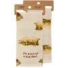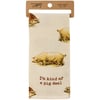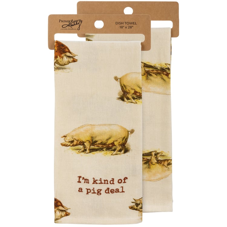 A cotton linen blend kitchen towel from our Farmhouse Collection featuring all-over vintage-inspired pig designs and punny embroidered "I'm Kind Of A Pig Deal" sentiment. Features a cotton tape loop in the corner for easy hanging. Machine-washable. Our I'm Kind Of A Pig Deal kitchen towel is packaged on a cardboard hanger with a hole to easily hang on rack.