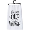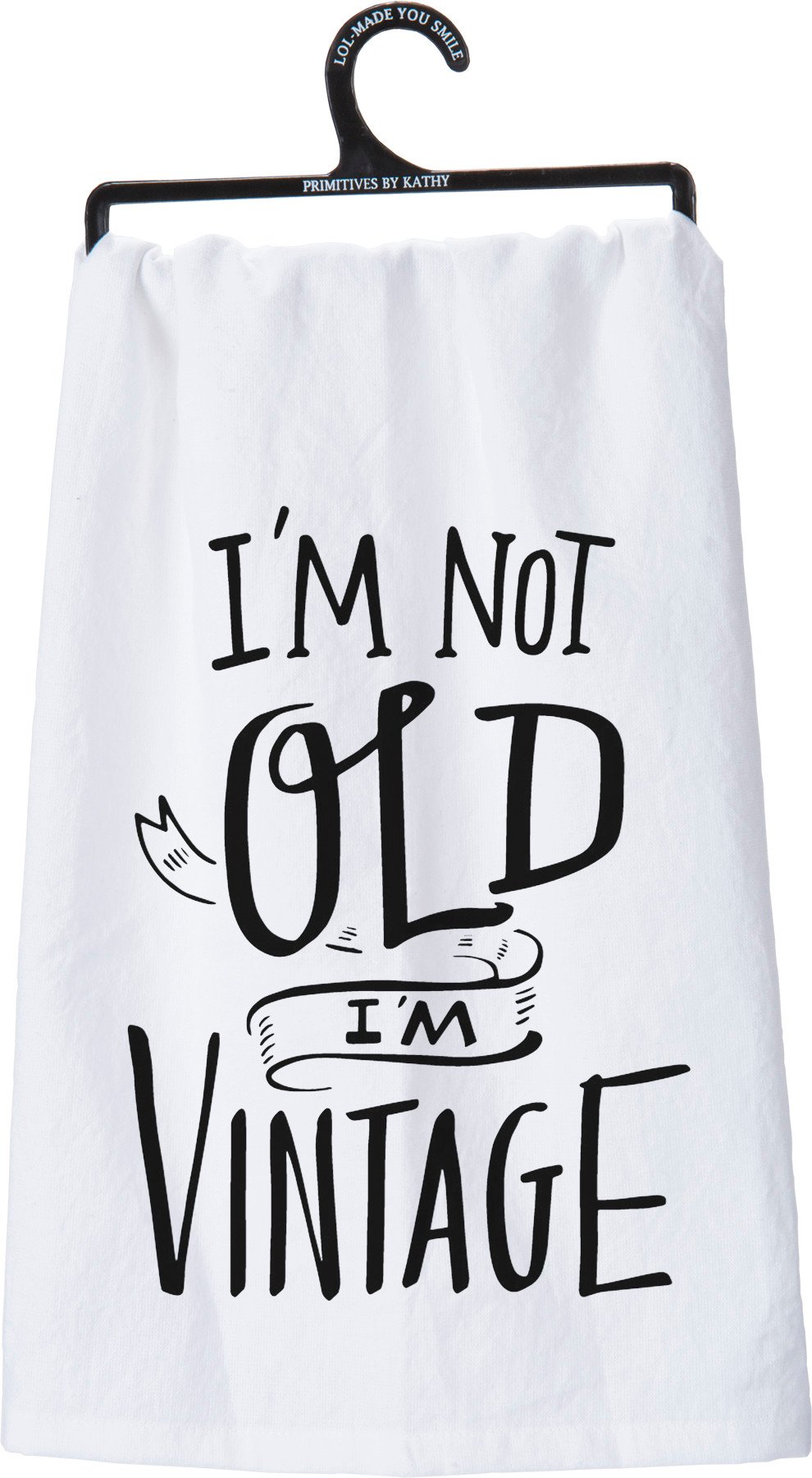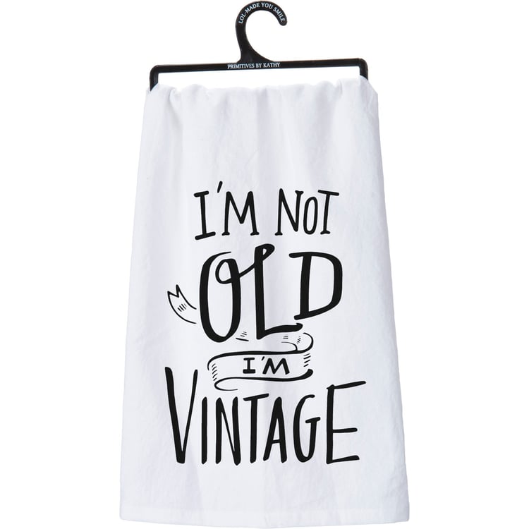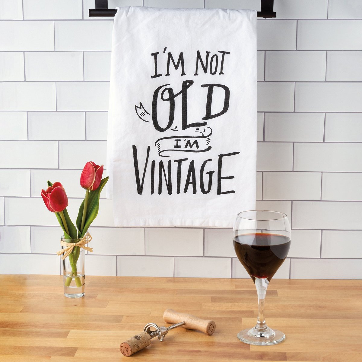 A black and white cotton kitchen towel from our LOL Made You Smile Collection lending a hand lettered "I'm Not Old I'm Vintage" sentiment that complements well with existing kitchen decor. The I'm Not Old I'm Vintage kitchen towel is machine-washable.