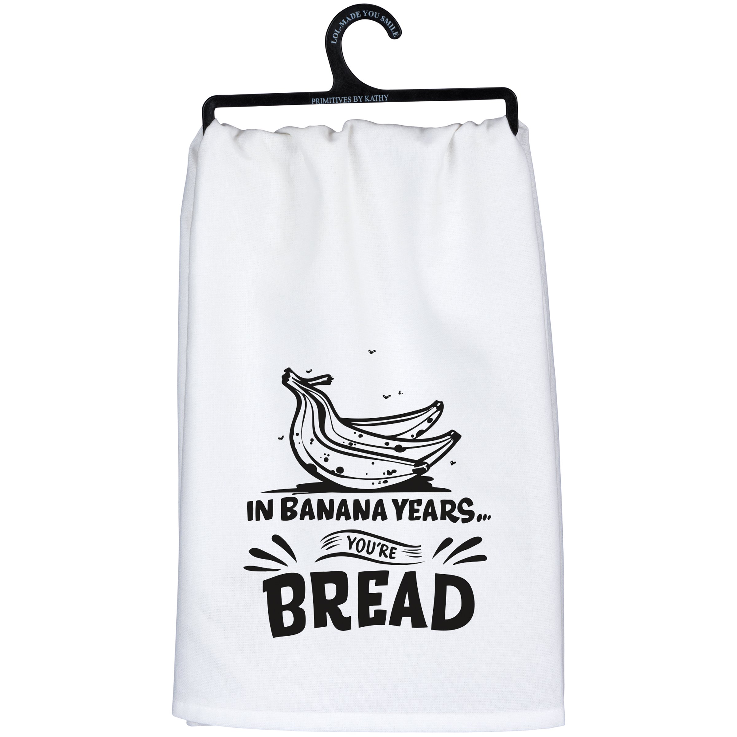 A black and white cotton kitchen towel from our LOL-Made You Smile Collection displaying old bananas above a sarcastic food inspired sentiment in a playful hand illustrated style that reads "In Banana Years... You're Bread." Our Banana Years You're Bread kitchen towel is conveniently machine-washable for easy cleaning. This funny kitchen towel is packaged on a black plastic hanger to easily display on rack. A sassy gift perfect for adding personality to any kitchen.