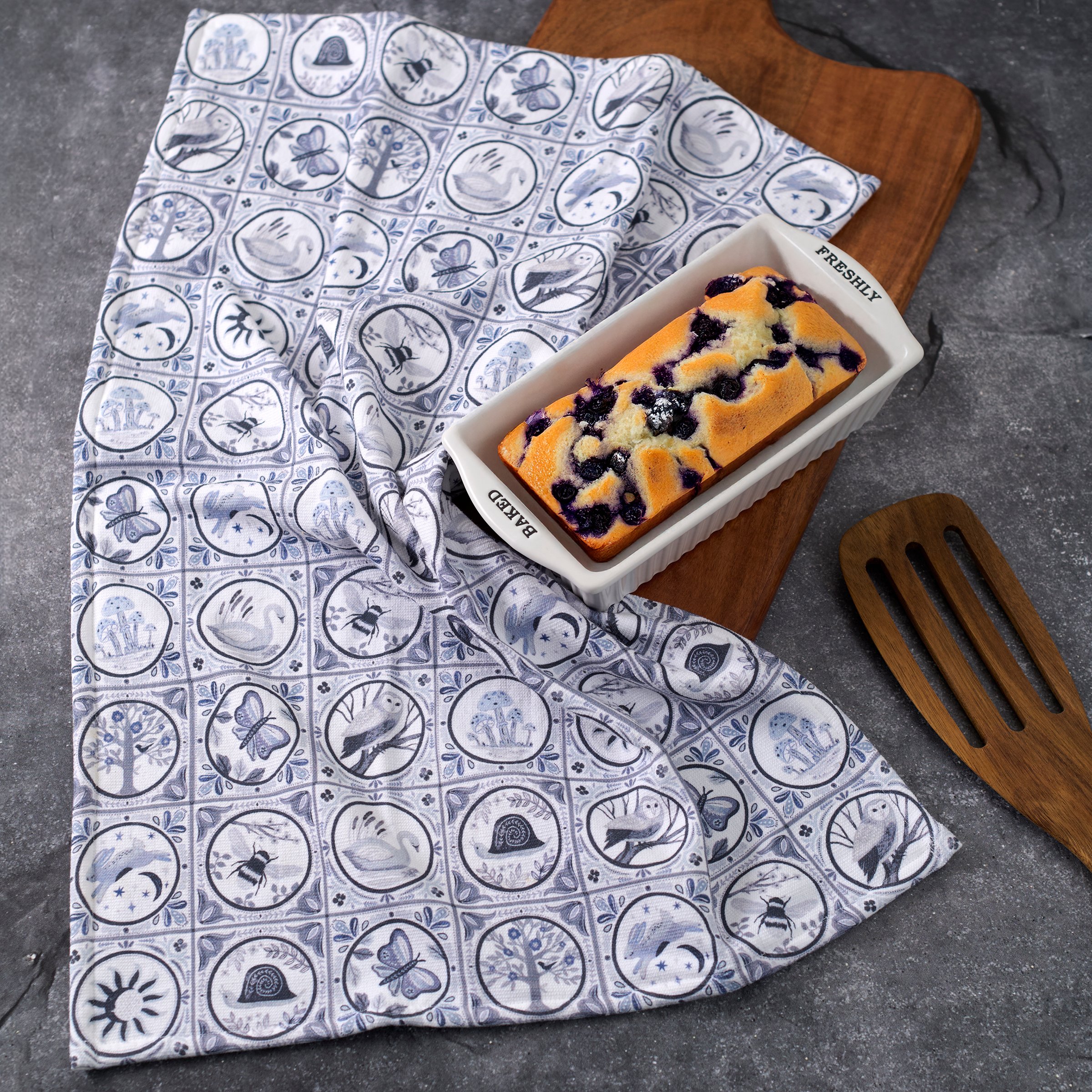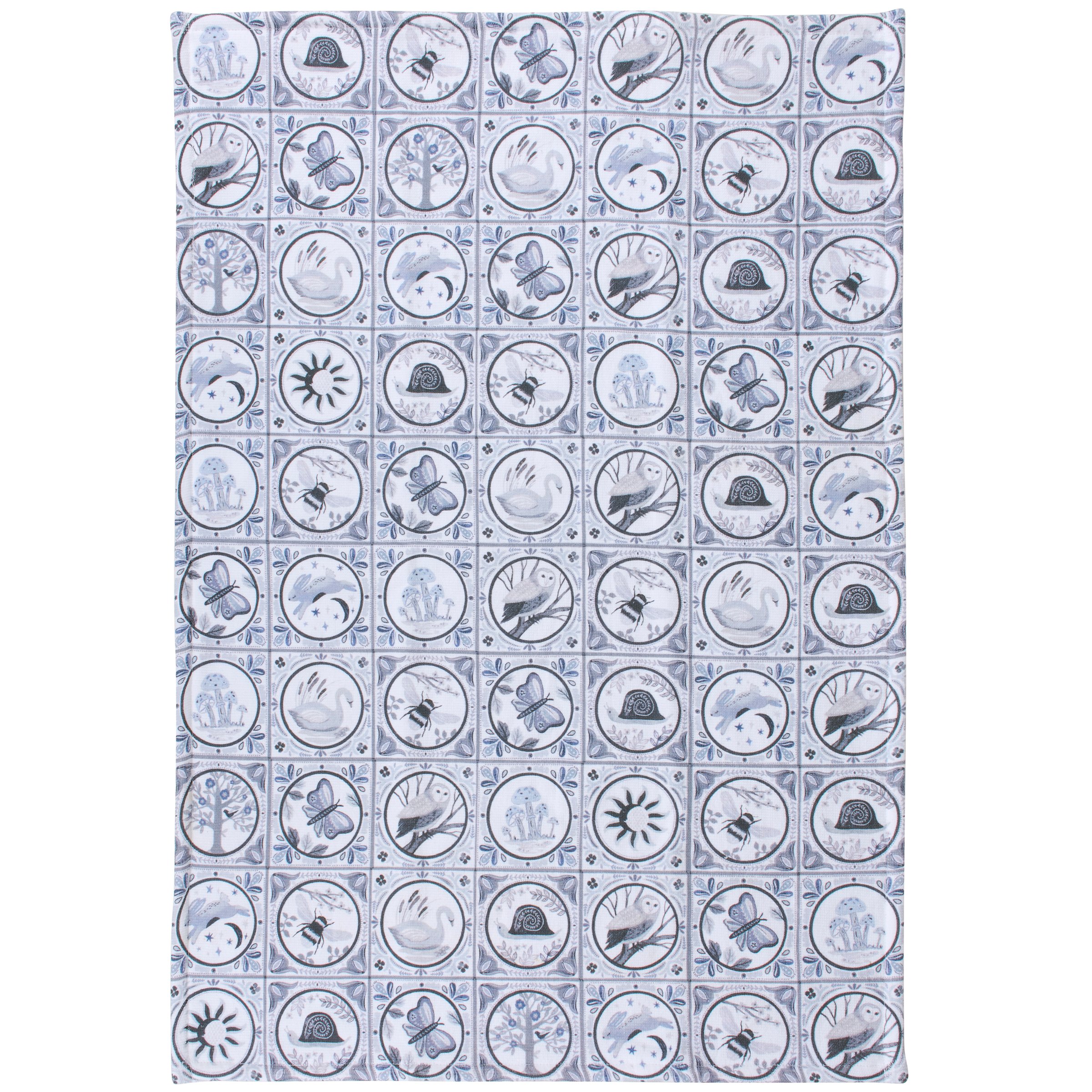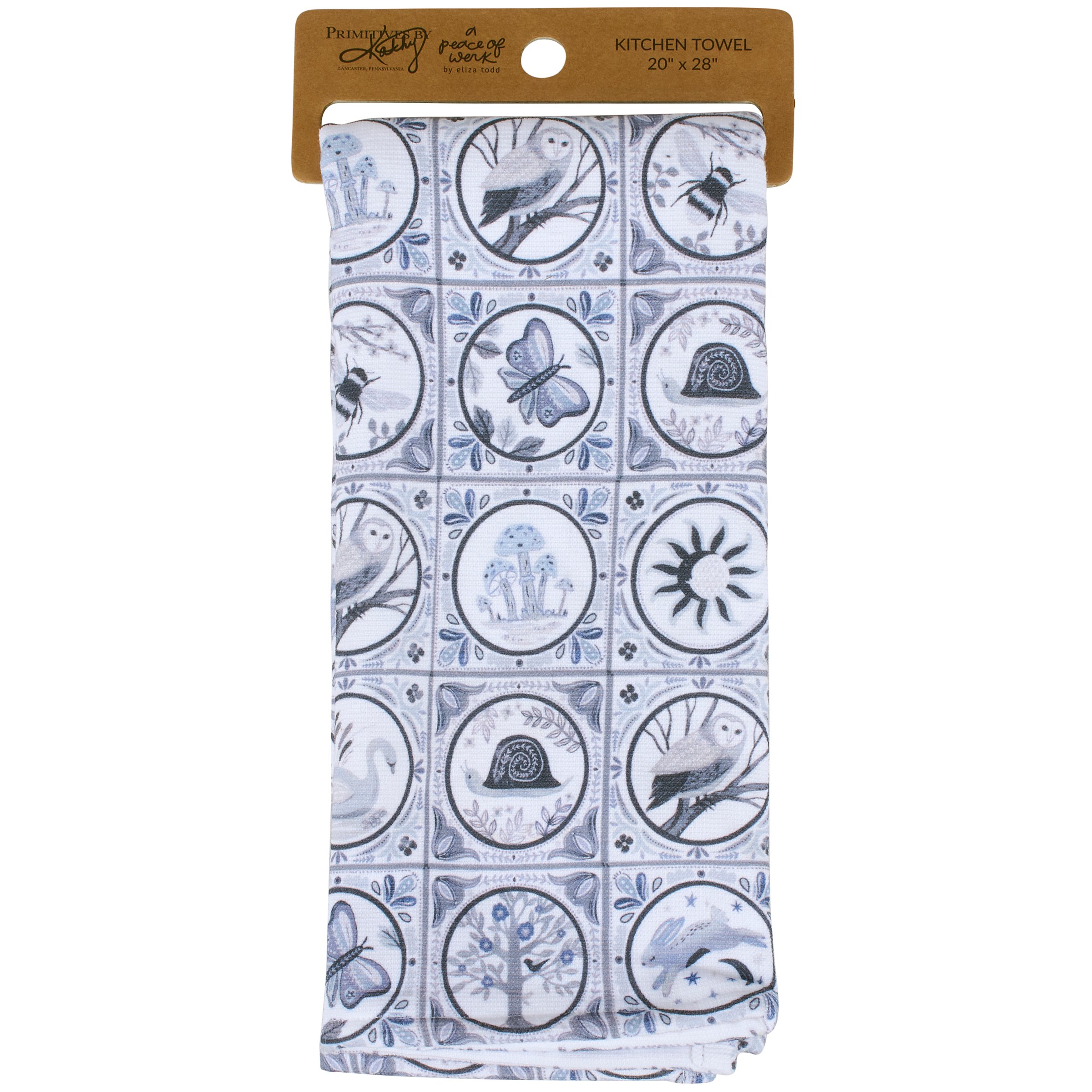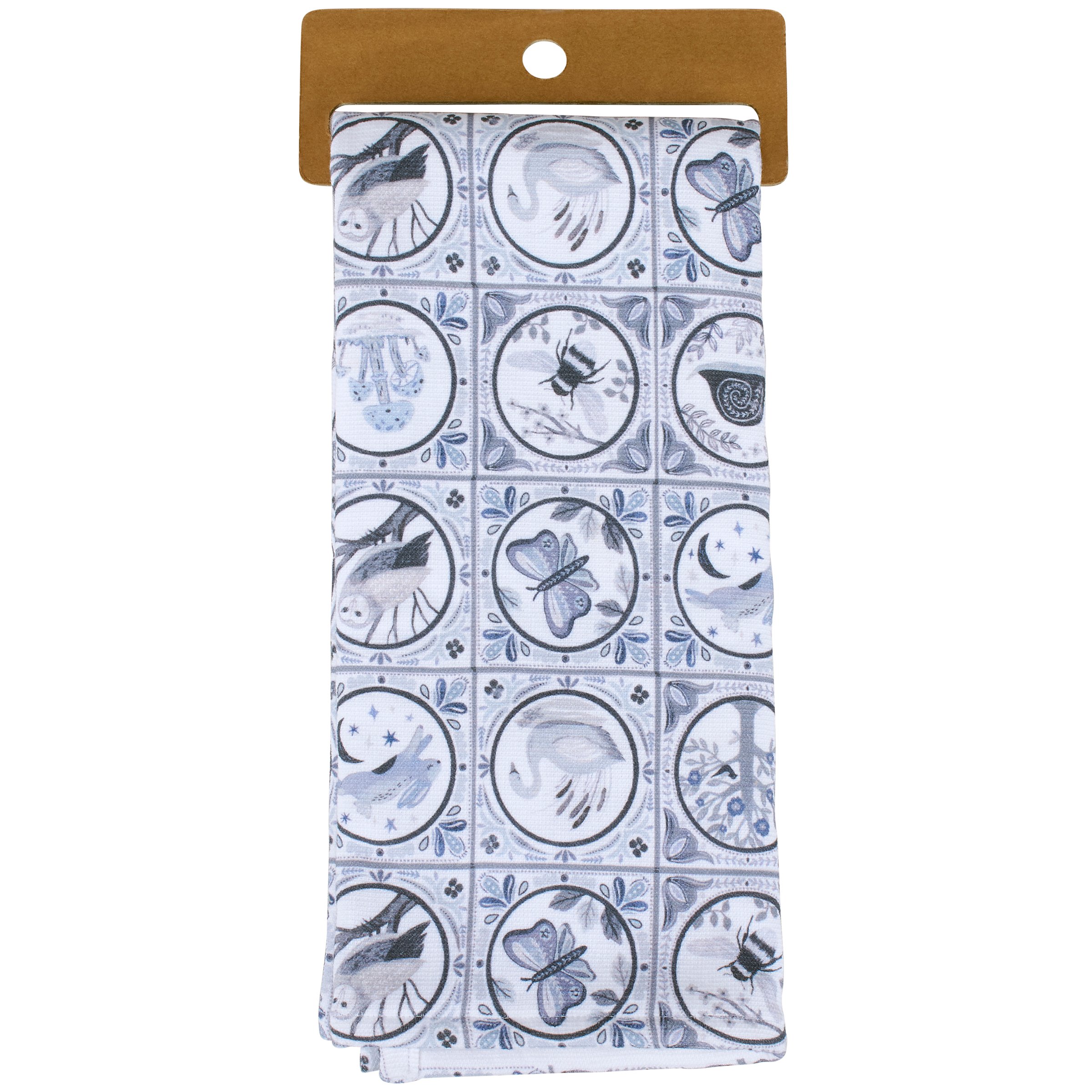 A cotton kitchen towel from our Home Collection featuring an all-over design displaying a pattern of tile inspired illustrations with various nature scenes in a calming indigo color palette. Nature tile kitchen towel features a terrycloth layer on the back for added absorbency. Our Indigo Tile kitchen towel is conveniently machine-washable for easy cleaning. Kitchen towel is packaged on a cardboard hanger with hole to easily display on rack. A nature themed kitchen accessory perfect for everyday use.