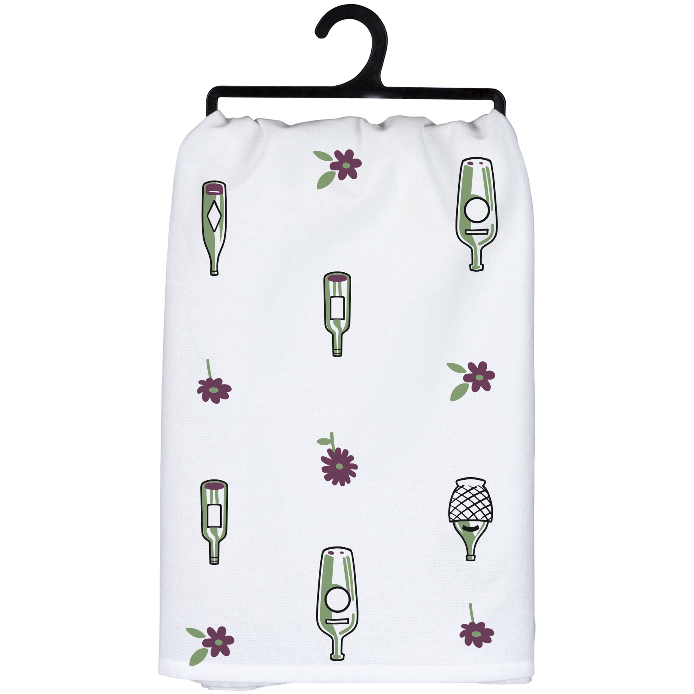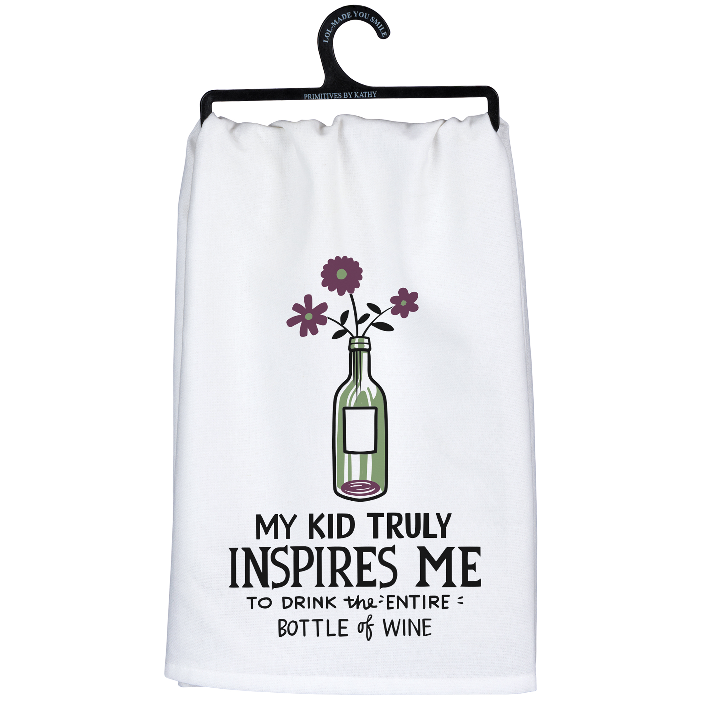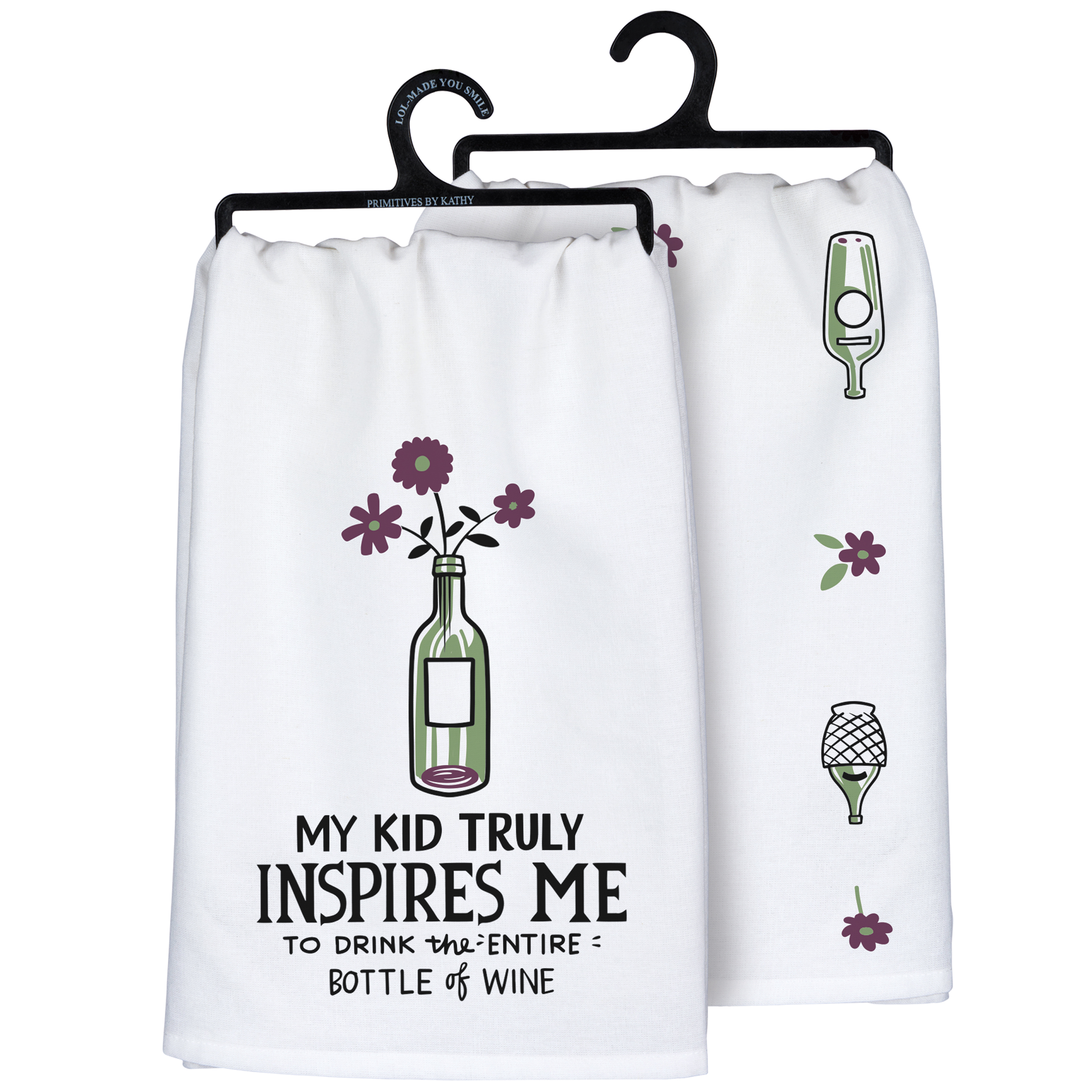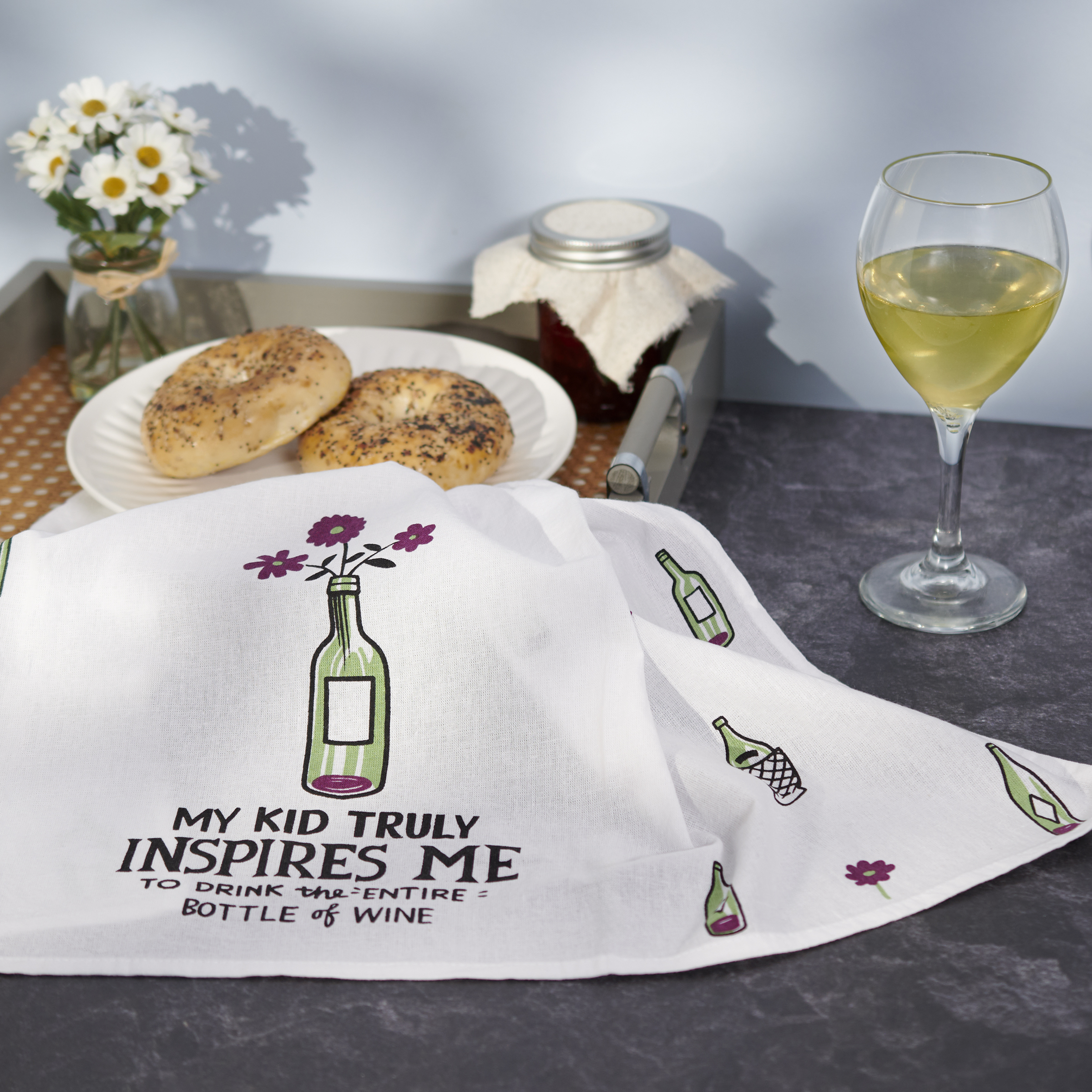 A cotton kitchen towel from our Mother's Day Collection displaying a unique hand illustrated design of flowers in a wine bottle above a fun mom-themed sentiment that reads "My Kid Truly Inspires Me To Drink The Entire Bottle Of Wine." Kitchen towel also features all-over designs of various style wine bottles and flowers. Our Inspires Me kitchen towel is machine-washable for convenient cleaning. Packaged on a black plastic hanger to easily display on rack. A fun gift perfect for Mother's Day or as an everyday home accessory.