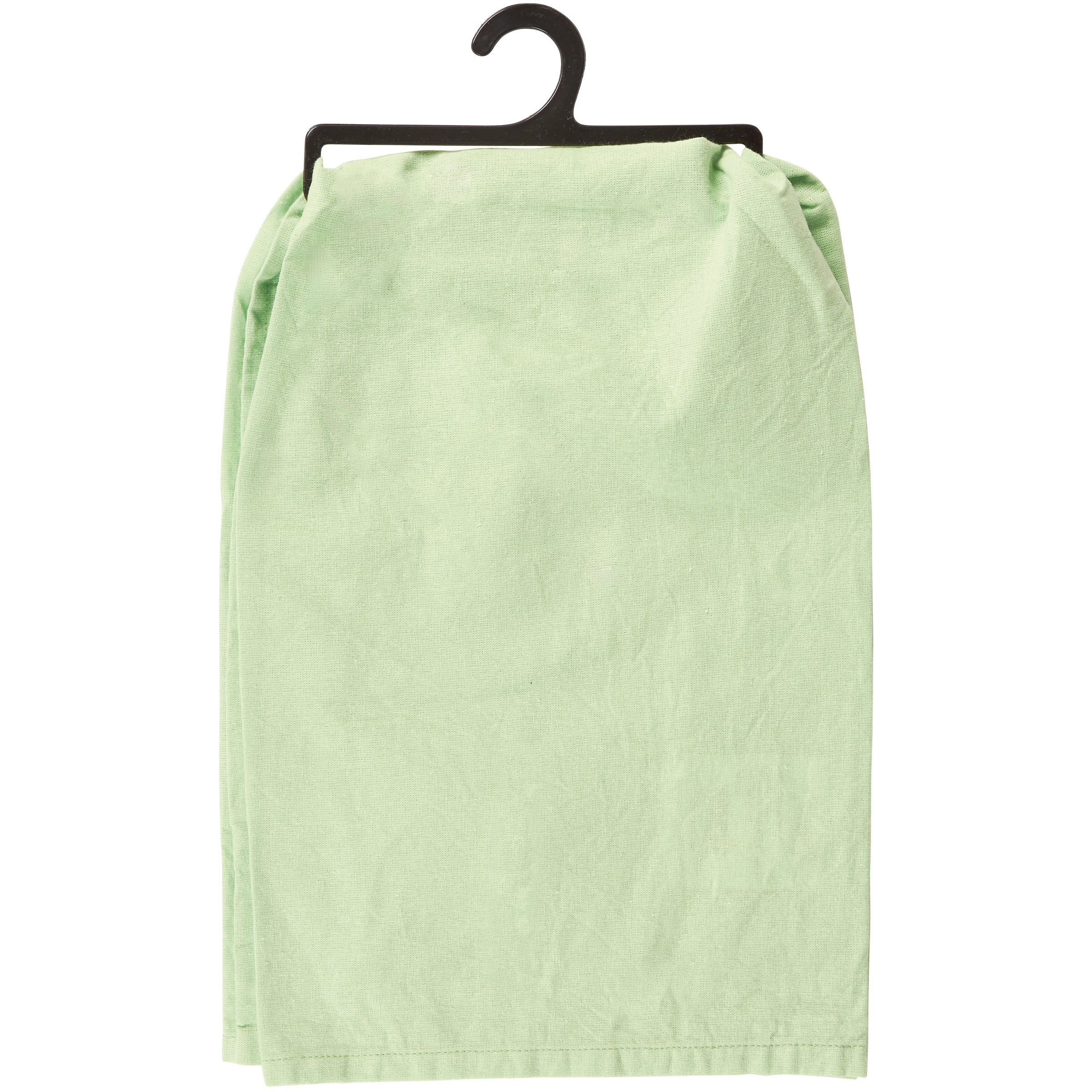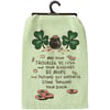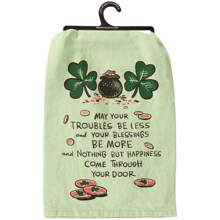 A green cotton kitchen towel from our St. Patrick's Day Collection displaying a unique hand illustrated design of shamrocks and a pot of gold with a seasonal sentiment that reads "May Your Troubles Be Less And Your Blessings Be More And Nothing But Happiness Come Through Your Door." Our Irish Blessing kitchen towel is conveniently machine-washable for easy cleaning. Packaged on a black plastic hanger to easily display on rack. An inspirational St. Patrick's Day gift perfect for a seasonal kitchen accessory.