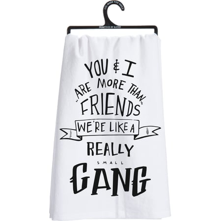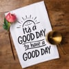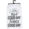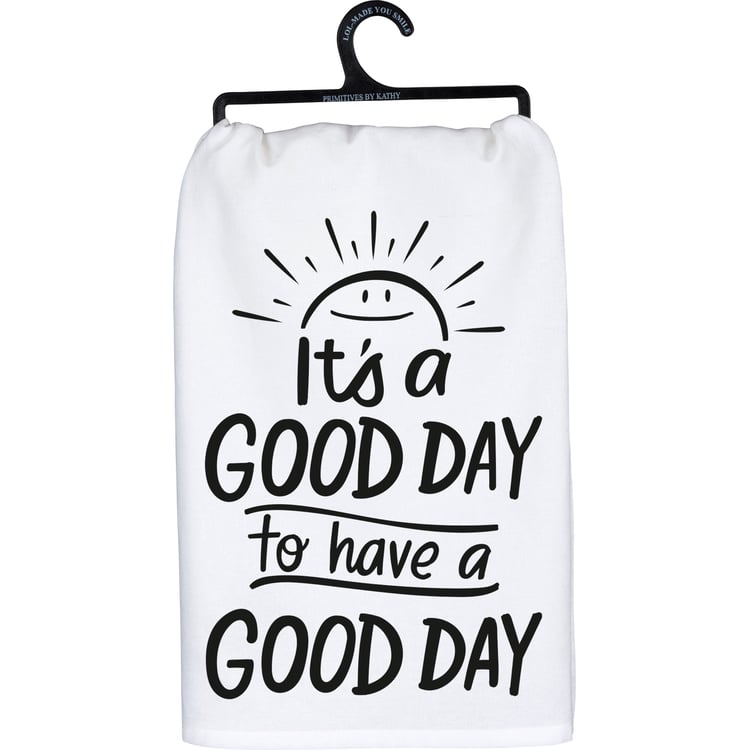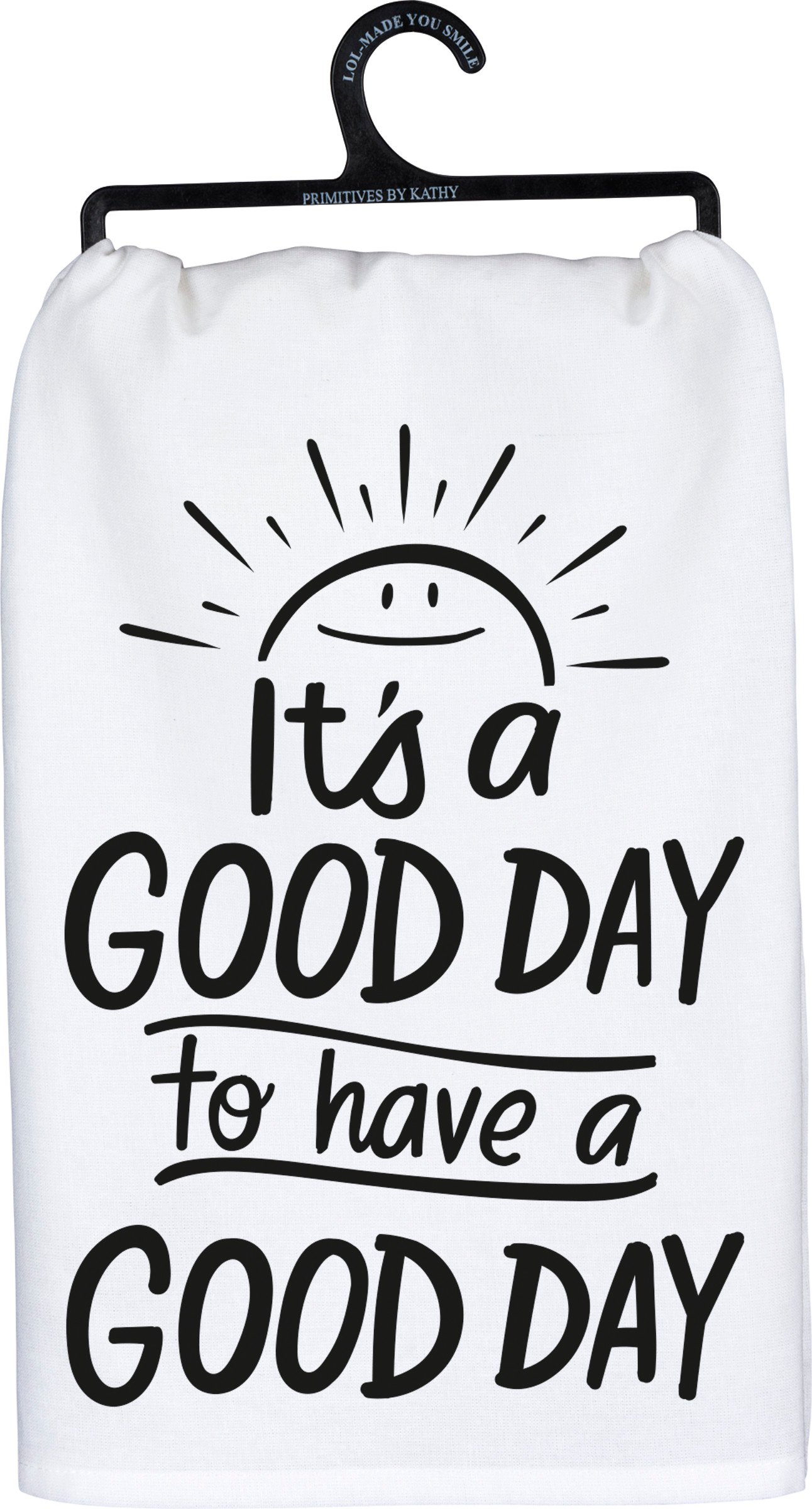 A black and white cotton kitchen towel featuring an "It's A Good Day To Have A Good Day" sentiment with a smiling sun design. Machine-washable.