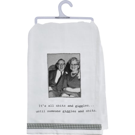 A cotton kitchen towel from our Trash Talk by Annie Collection features a stitched art panel featuring a vintage photograph, "It's All Shits And Giggles… Until Someone Giggles And Shits" sentiment, and gingham ribbon trim. Our And Giggles kitchen towel is machine-washable.