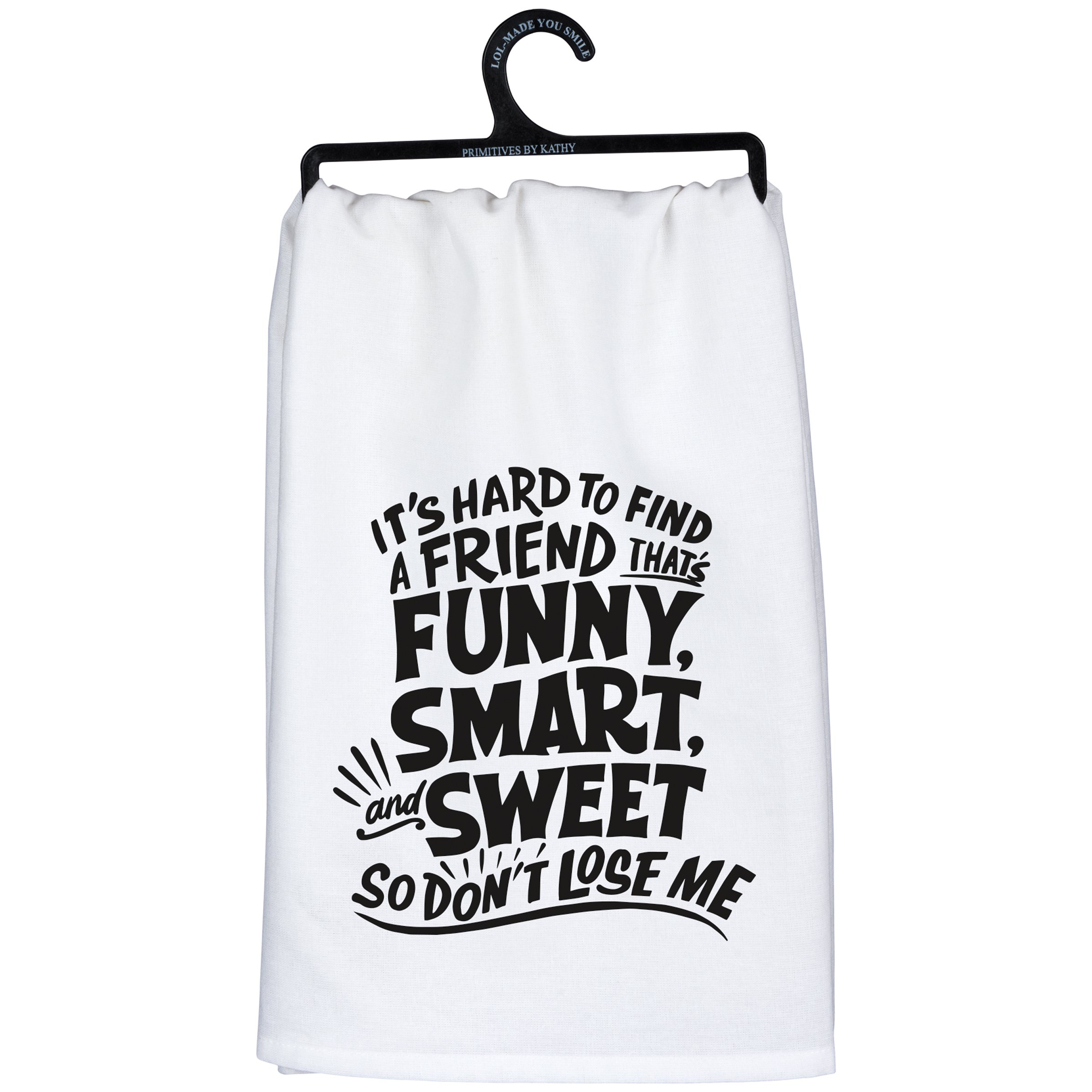 A black and white cotton kitchen towel from our LOL-Made You Smile Collection displaying a sassy friend themed sentiment in a playful hand illustrated style that reads "It's Hard To Find A Friend That's Funny, Smart, And Sweet So Don't Lose Me." Our It's Hard To Find A Friend kitchen towel is conveniently machine-washable for easy cleaning. This funny kitchen towel is packaged on a black plastic hanger to easily display on rack. A fun friend gift perfect for an everyday kitchen accessory.
