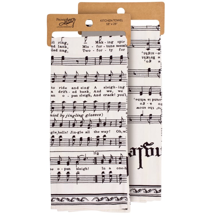A cotton kitchen towel from our Christmas Collection displaying an all-over design of vintage sheet music for Jingle Bells. Our Jingle Bells kitchen towel is conveniently machine washable for easy cleaning. Vintage kitchen towel is packaged on a cardboard hanger with hole to easily display on rack. A vintage Christmas kitchen accessory perfect for adding seasonal style to any kitchen.