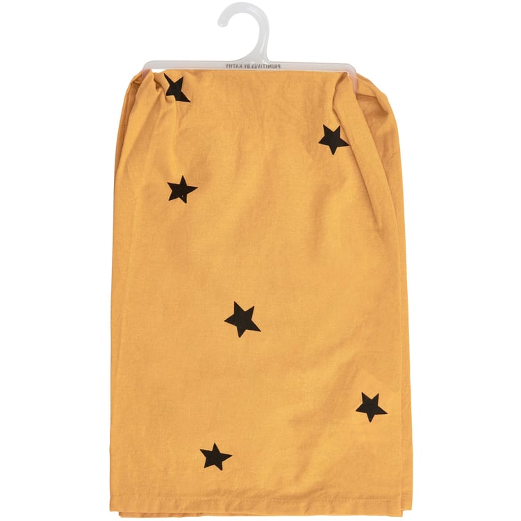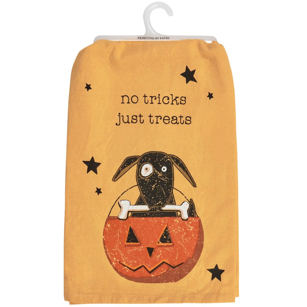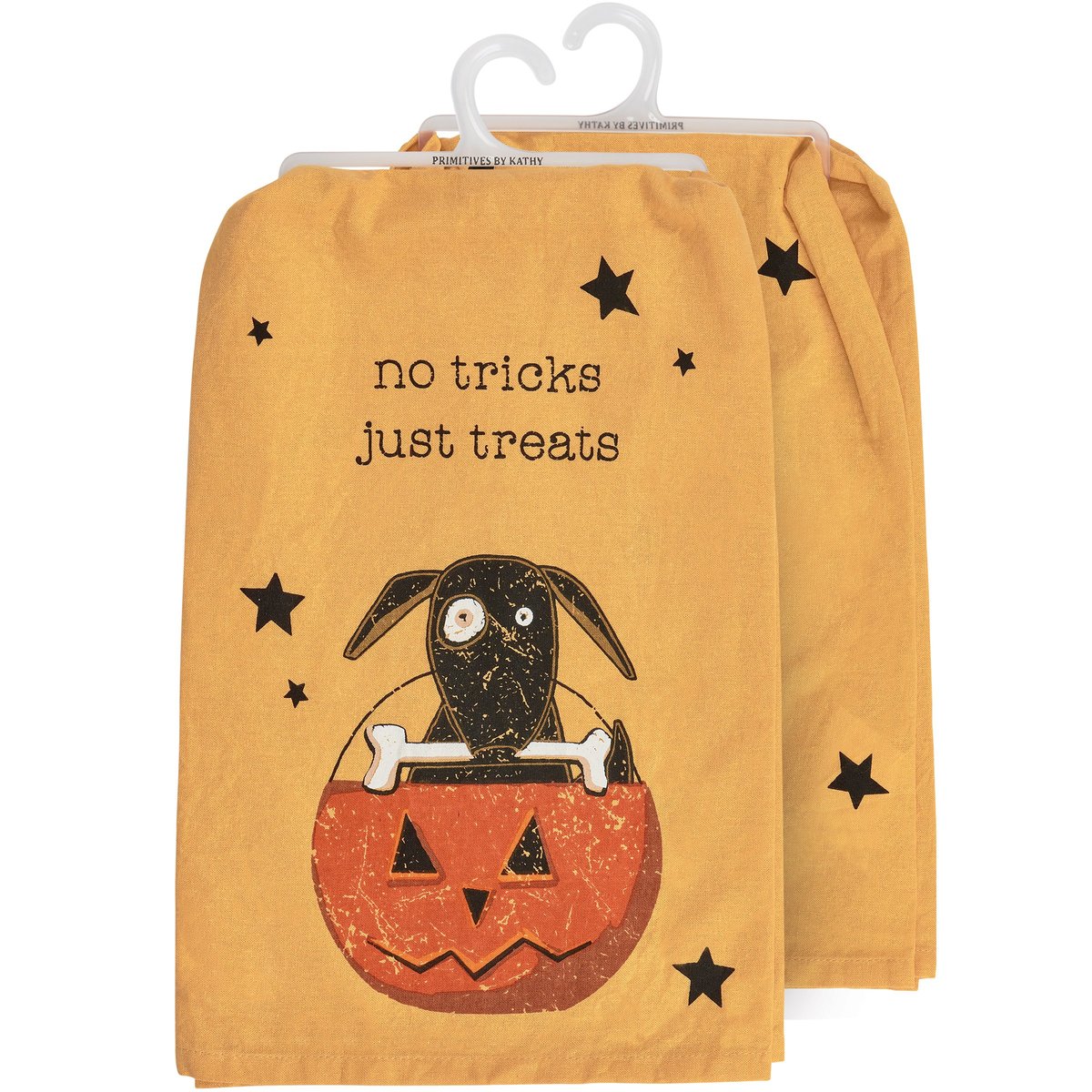 A rustic-inspired cotton kitchen towel from our Holiday Pet Collection displaying a design of a dog holding a bone and sitting in a jack o'lantern treat bucket with a fun pet-themed sentiment that reads "No Tricks Just Treats." Design also features an all-over print of stars. Our Just Treats kitchen towel is conveniently machine-washable for easy cleaning. Seasonal kitchen towel is packaged on a clear plastic hanger to easily display on rack. A fun pet-themed kitchen accessory perfect for seasonal use.