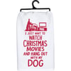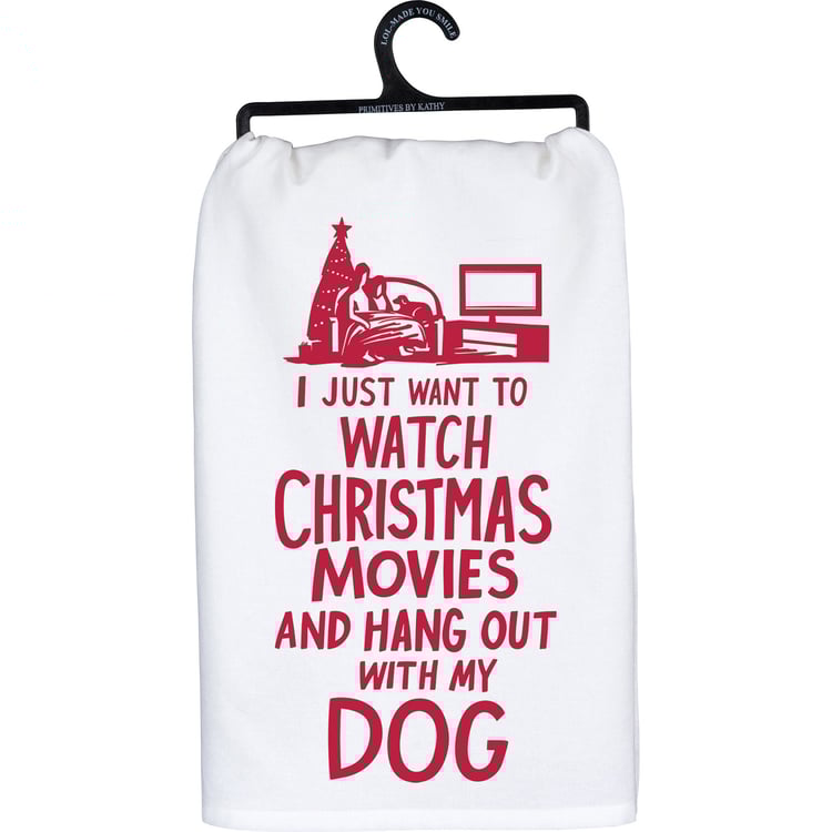 A white cotton kitchen towel featuring an "I Just Want To Watch Christmas Movies And Hang Out With My Dog" sentiment with living room scene design featuring a dog. Machine-washable.