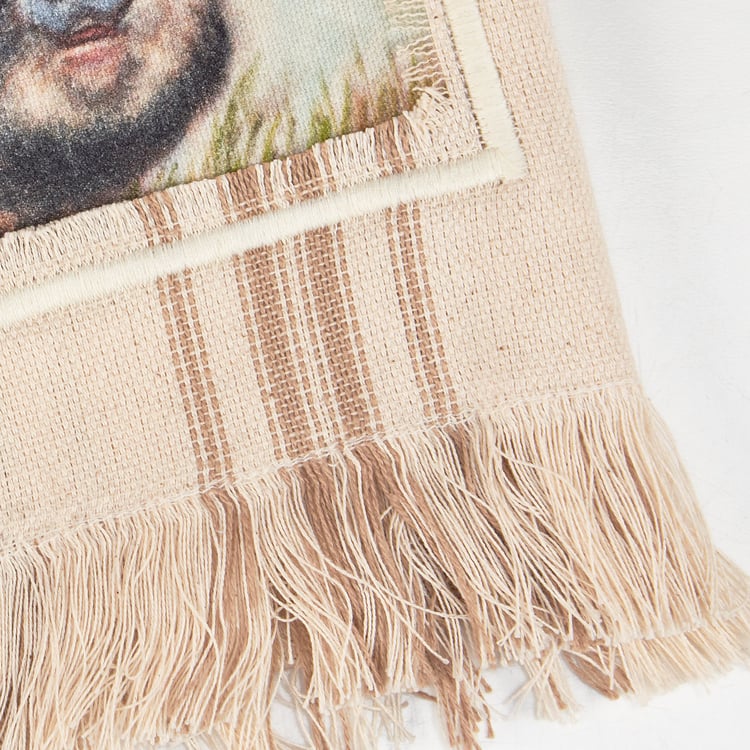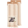 A cream cotton kitchen towel from our Farmhouse Collection featuring a stitched art panel with frayed border and woven brown stripes throughout. Design displays a kune kune pig in a field replicated from original artwork painted onto burlap canvas, giving the art a unique depth and texture. Our Kune Kune Pig kitchen towel is machine-washable for convenient cleaning. Packaged on a cardboard hanger with hole to easily display on rack. A rustic kitchen accessory perfect for everyday use.
