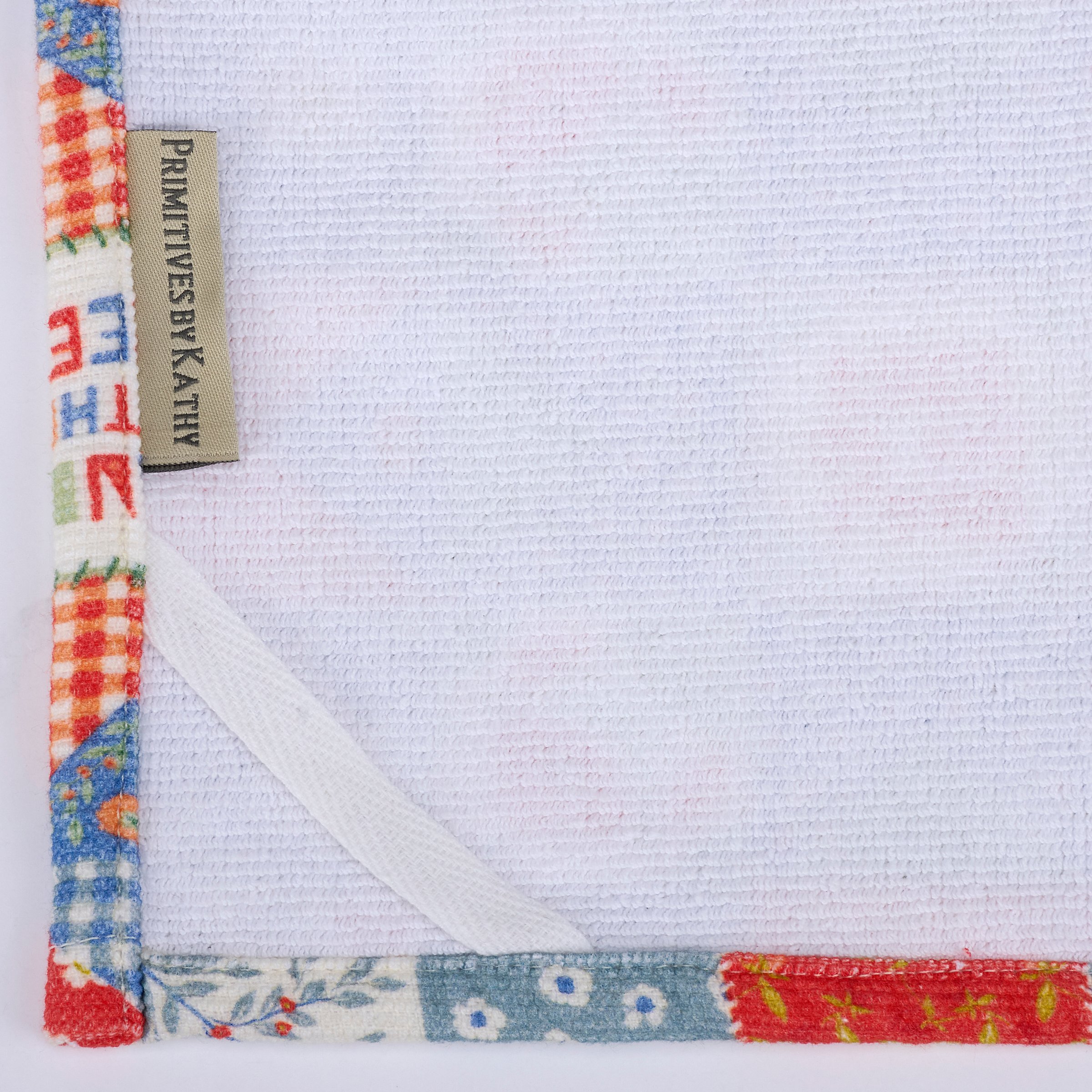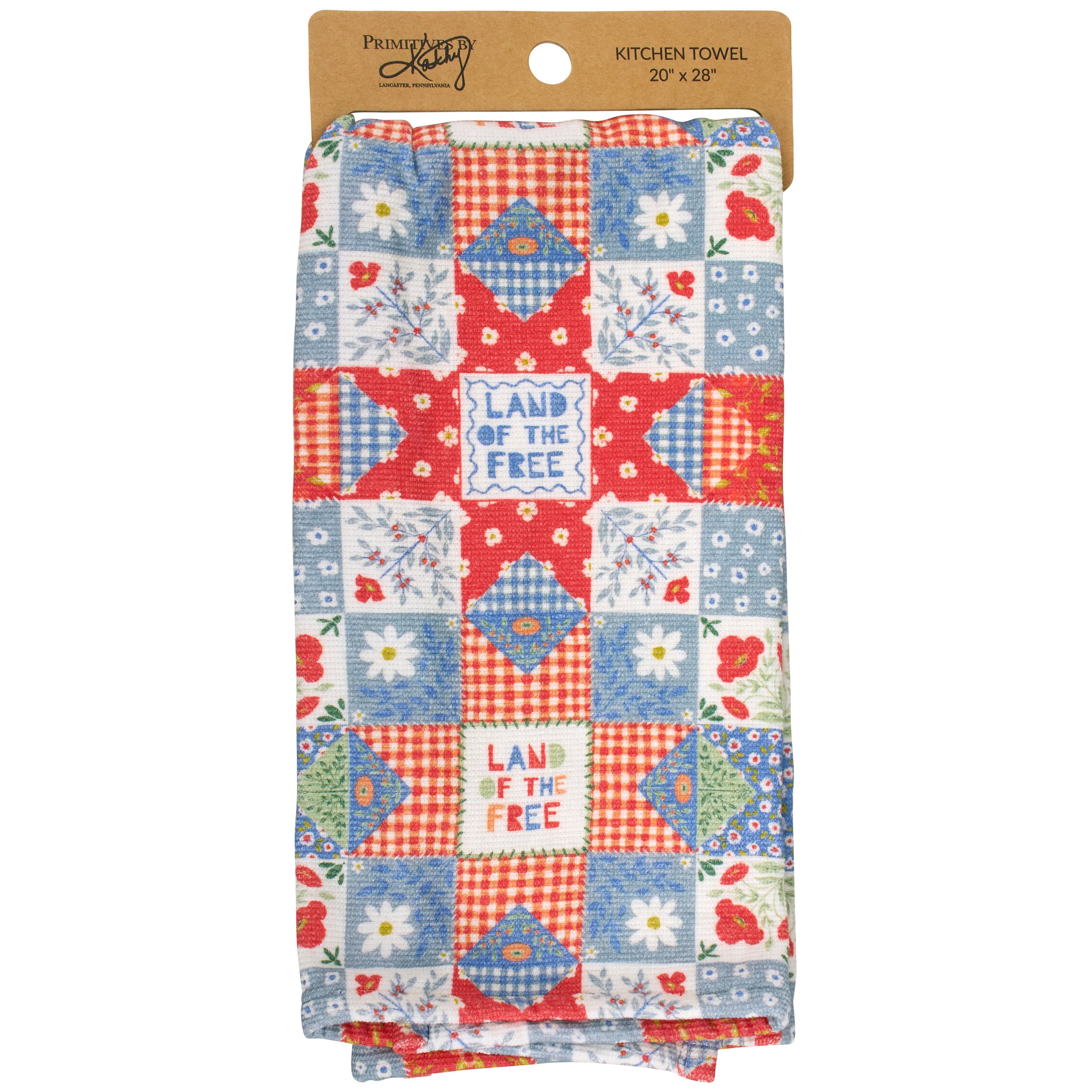 A cotton kitchen towel from our Patriotic Collection featuring an all-over design displaying a pattern of folk art inspired quilt block designs with a patriotic color palette and sentiment that reads "Land Of The Free." This patriotic kitchen towel features a terrycloth layer on the back for added absorbency. Our Land Of The Free kitchen towel is conveniently machine-washable for easy cleaning. Kitchen towel is packaged on a cardboard hanger with hole to easily display on rack. A patriotic kitchen accessory perfect for 4th of July and Memorial Day decorating or celebrating stars and stripes all year round.